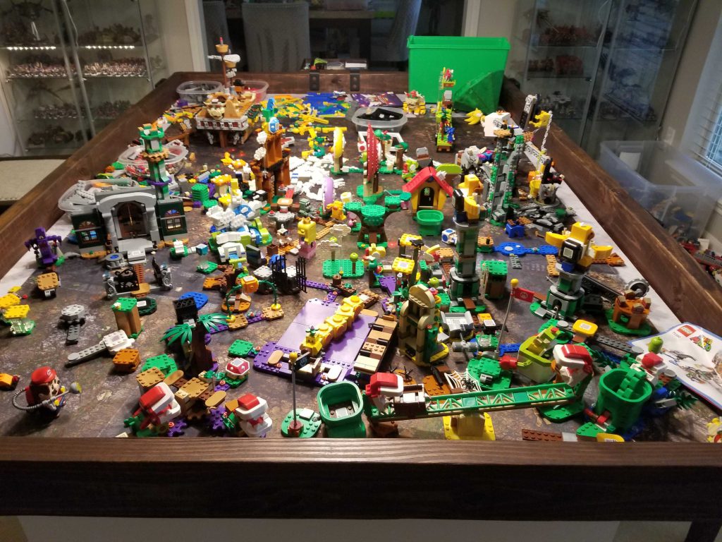 Another close loss to Tyranids and now I've been firmly punted to the 2-2 bracket. That's fine, I tell myself - I would legitimately prefer the 2-2 bracket to the 3-1, as the 2-2 bracket has far, far fewer Tyranids players and more Chaos Marines, T'au, Grey Knights, Marines, and Custodes. This is fine. Thomas and I walk over to Panera for lunch and end up stopping in the Legoland store next door, where we pick up toys/souvenirs for our sons. Bryce and I have been going nuts building every LEGO Mario set, and on weeks where I don't have any games to play my gaming table looks more like this: