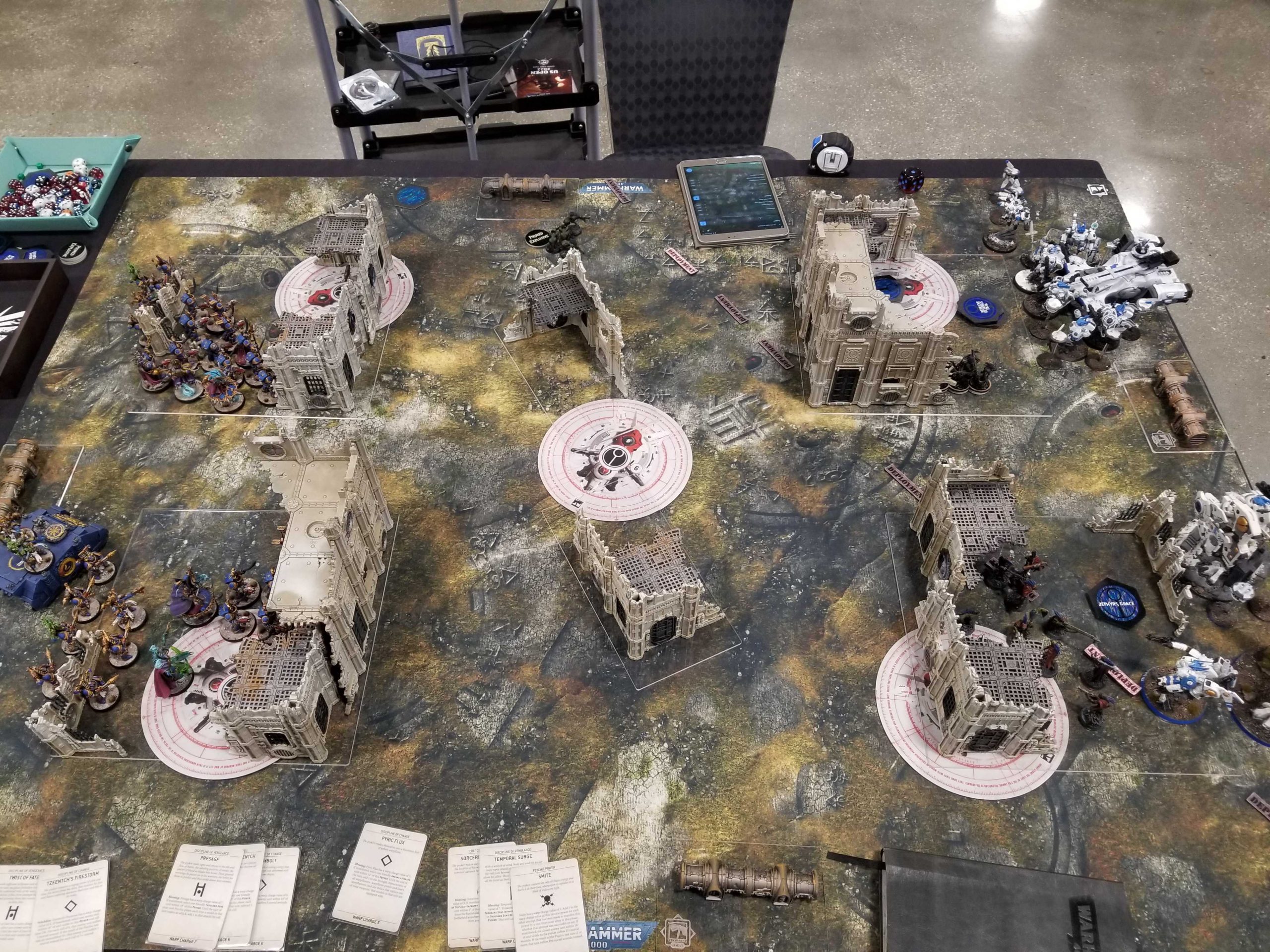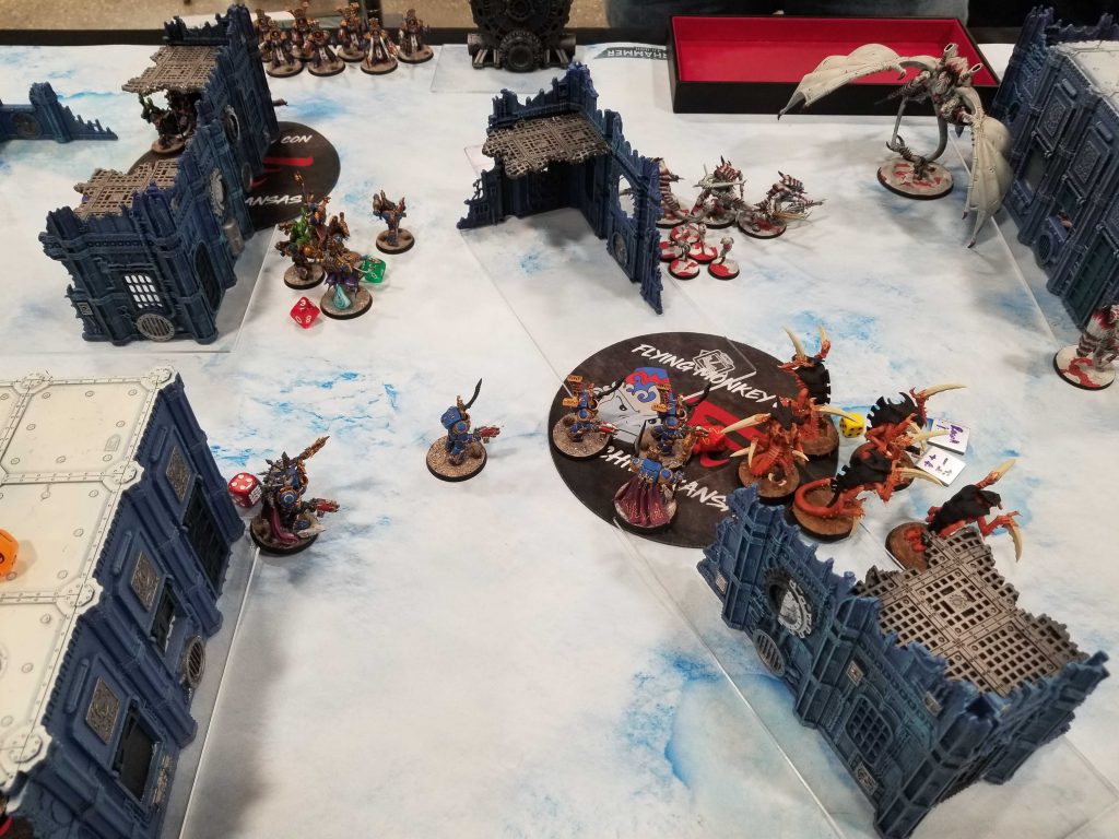 After things were not going so greatThat's not great, but I get some mileage here out of paying 2 CP to forward-deploy a unit of rubrics to ensure I can score 2 VP on the first turn. This was a rough game dicewise; I struggled with Wrath of Magnus for most of it thanks to some bad tests and had a particularly disastrous turn 5 where I couldn't seem to get off any of the powers I needed. That ended up being a killer as I was never able to do finish off Ben's Hive Tyrant or put a big enough dent in his Raveners before they crashed into me. There isn't a ton to say about this game - it was a close affair where I scored well early, but Dan was able to net some key kills at the end and got a bonus roll with Cranial Feasting that put him on 9 VP there. At game's end the score was 42-45 on primary and I was ahead 34-33 on secondary, meaning I lost by 2 points.