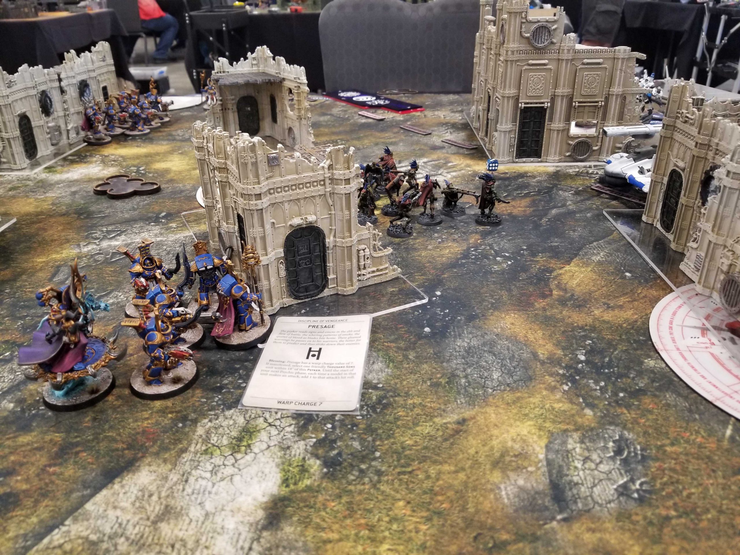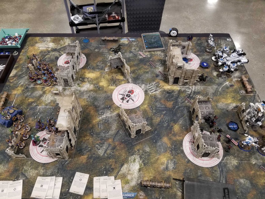 T'au aren't really a problem for Thousand Sons. Sure, I don't get Wrath of Magnus, but I can usually make up for it reasonably elsewhere and on GW terrain the short sightlines favor me OK, plus I don't have any big targets for his Hammerhead to shoot. My goal here is to do the same as every other mission and bait him out while scoring more secondary points.
