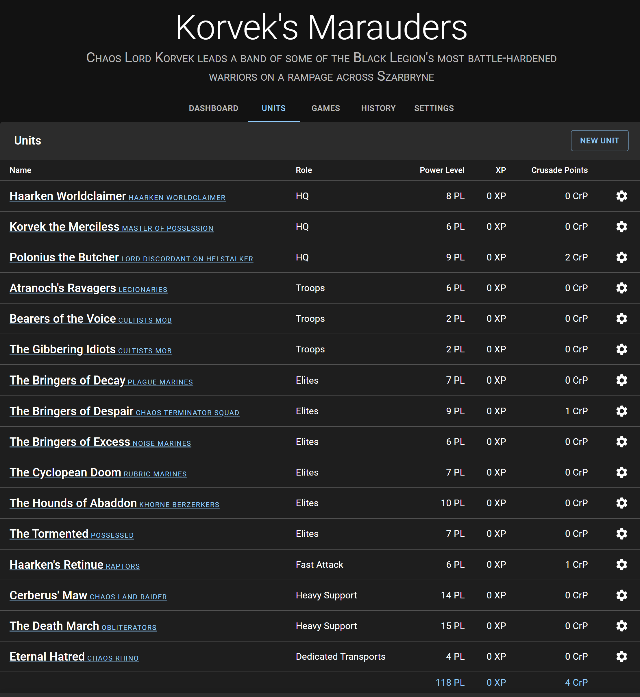 Building a list for a Crusade event like this is a completely different beast from building for competitive play. For one, we have 150 PL to work with for a roster, from which we can draw units for 50 PL and 100 PL games. That doesn’t necessarily mean you want to use a bunch of different units, however. There are a few things to keep in mind when building a list for this event:- When you work with PL you generally need to stick to either minimum size squads or maximum size, as the way PL increases means it doesn't make sense for you to have say, 6 Rubrics when adding the sixth model costs a full 6 PL, the same as running ten models.