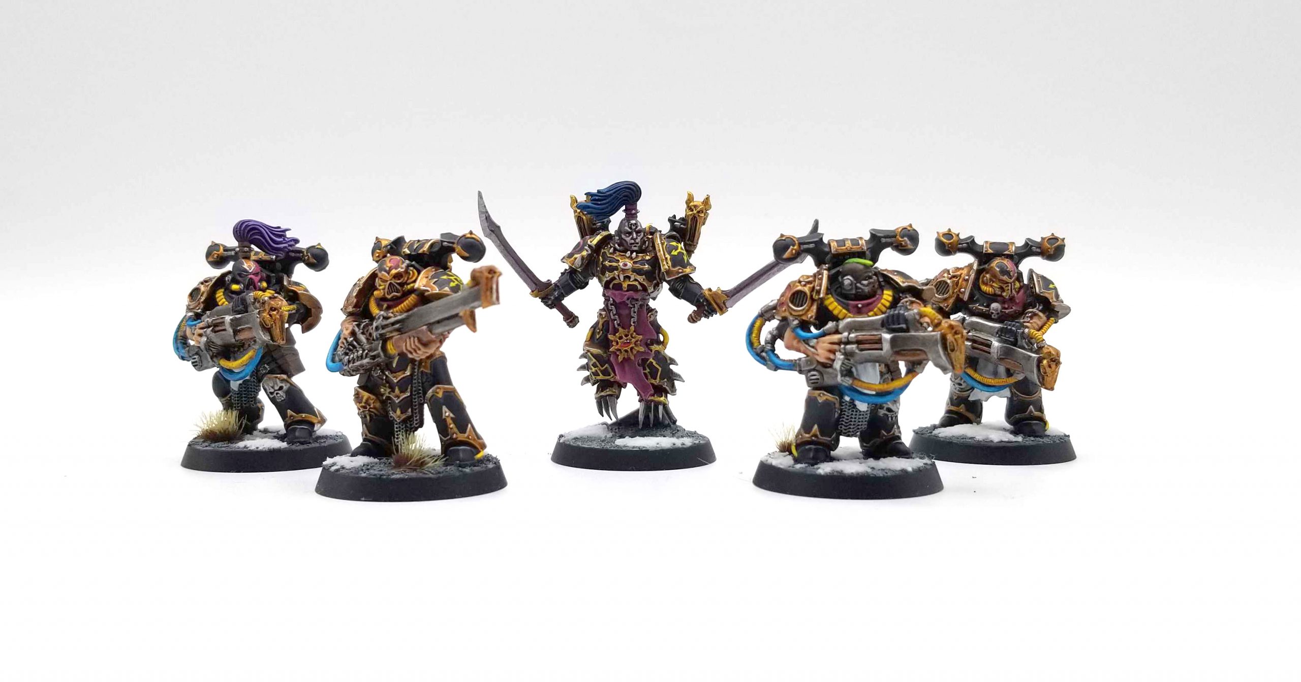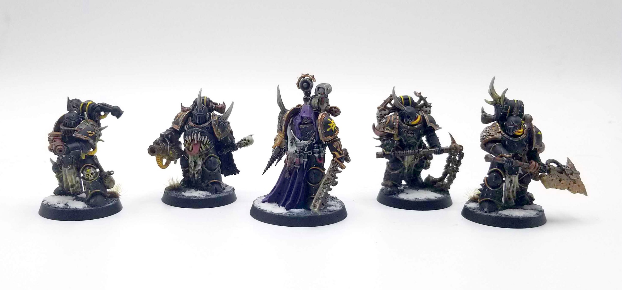 Hoo boy. I have been insanely busy painting over the past two weeks. I wanted to not just run Black Legion at the narrative finale, I wanted to make sure my Narrative List was capable of winning best painted, and that meant putting in the extra work to make the units look as good as possible, as well as retouching some older models. Generally, I had to finish the Rubrics, Plague Marines, and Noise Marines, plus a Land Raider and a unit of Five Terminators, plus if I had time I'd need to do another 2.5 Possessed - they may not make the cut as I write this.Overall however, the work has been going well. I'm very pleased with how the cult marines turned out: