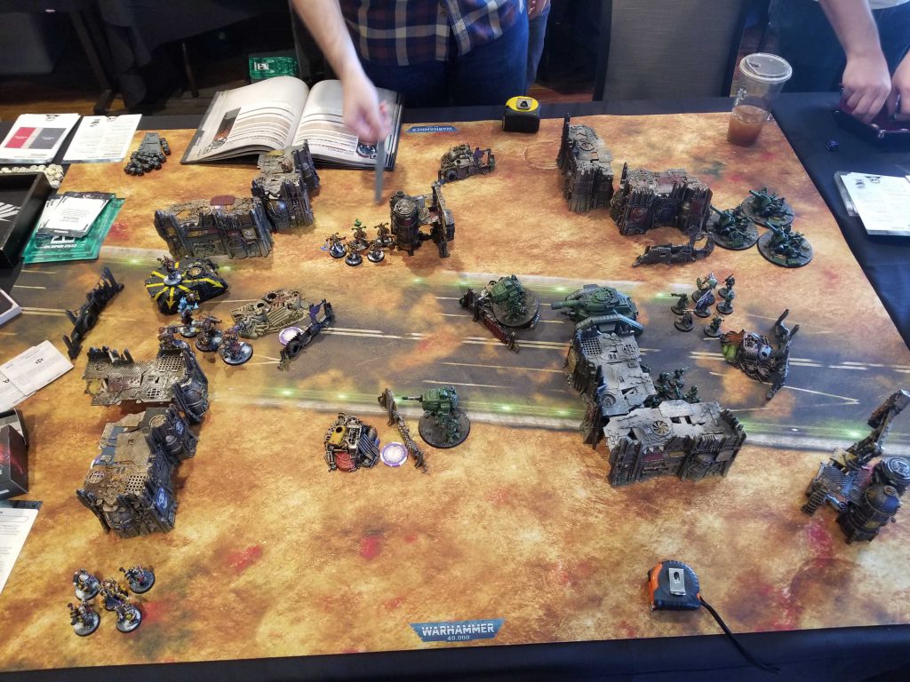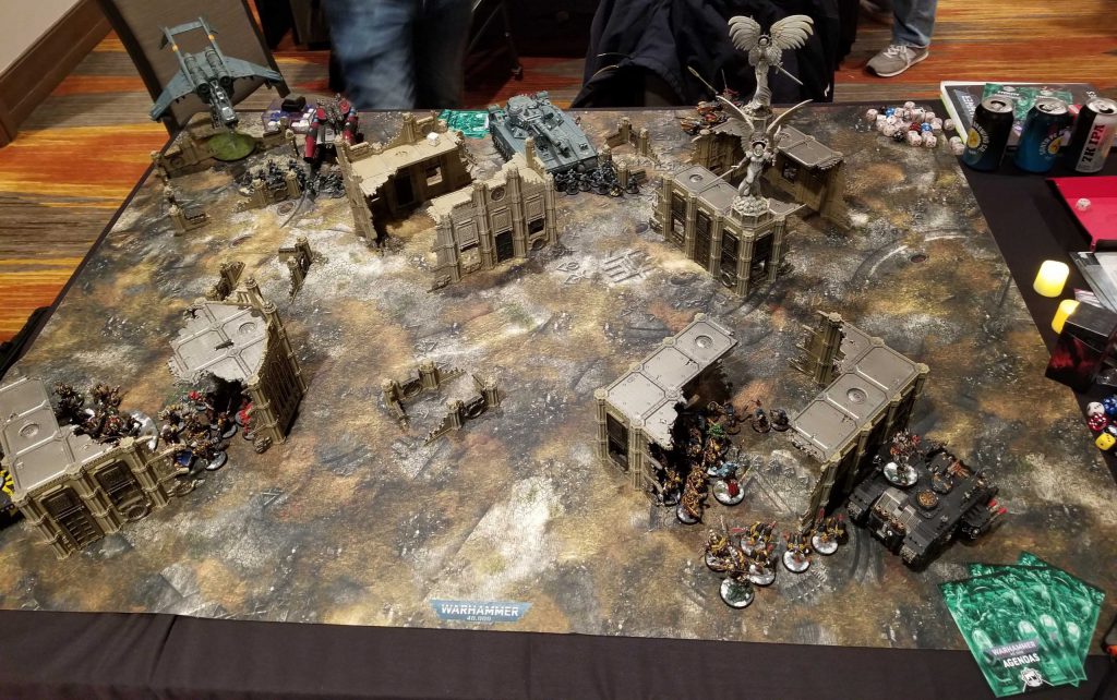 The event kicks off on a Friday, a full day before the competitive events begin. Given their format, I think this is *probably* a mistake, since playing seven games in three days is a bit too much and this is the kind of move I think they only put in place to cut down on hotel costs (though it likely makes it easier for participants to fly out as well). The schedule for day 1 is interesting in that we’re only slated to play two 50PL (1,000 points) games, and given four hours to play each one. That is an insane amount of time, but given how many players are on their first game or just don’t play often, it makes some sense. It also means there’s more time to get in extracurriculars between games, something encouraged by the event organizers. This is helpful for say, Chaos Knights players, who need to grind a number of games to be able to take their rewards. I’ll get in one extra game on day 1 – a 25 PL game against Norman – mostly to help get my Terminators to their first upgrade.