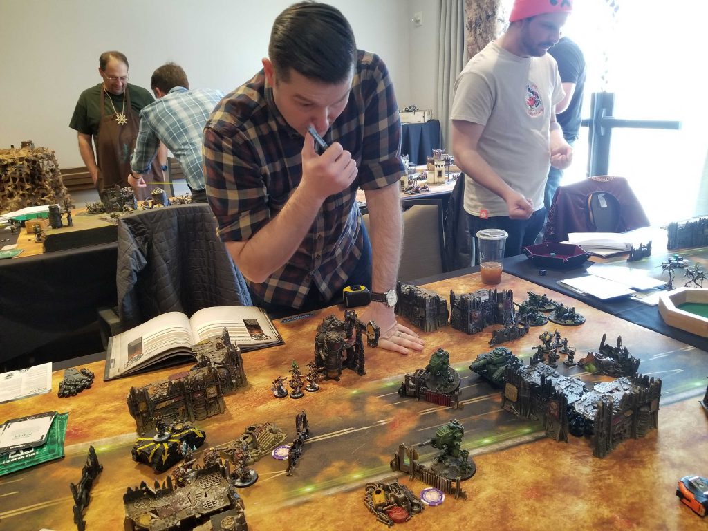 Scott trying to out-think a 6+ situationWe’re being paired with Battlegroup 6, which is mostly Goonhammer players (including Dan Boyd, Jack Hunter, Scott Horras, Rocco, and Campbell), making it one of the raddest groups at the event. The Imperial players are asked to choose tables to play at while team Chaos is allowed to pick our pairings as the attackers (though we’ll roll for attacker/defender in the mission). This is where I help our team out by helping pick our matchups. This is important because there are a lot of Chaos Knights players on our team, most of them pretty new to the game. I match up as many of them as I can into non-Salamanders Space Marine armies, hoping to give them winnable games. They will go on to lose most of them.