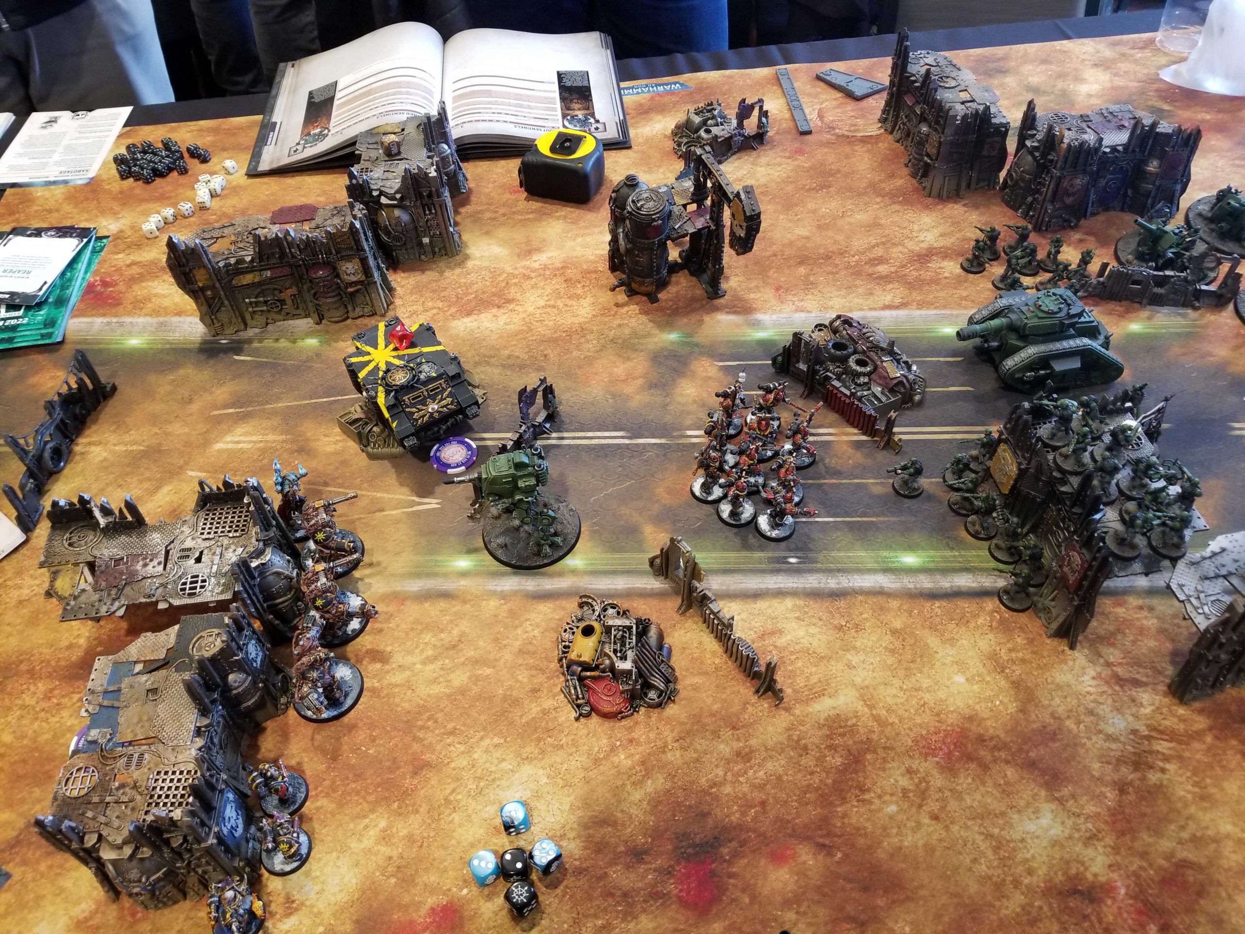 We are once again allowed to allocate tables so I try and give my Chaos Knights players some help getting good matchups. We're short a Chaos player so I volunteer for a 2v1 game, and end up getting paired into Matt and Luiz, playing Astra Militarum and Custodes, respectively. That means it's my 100 PL vs their 50 each, and we both need to get units off the far table edge. This is done by doing an action at the end of the movement phase with a unit that's within 6" of the table edge, and vehicles have to spend two turns doing the action to leave.