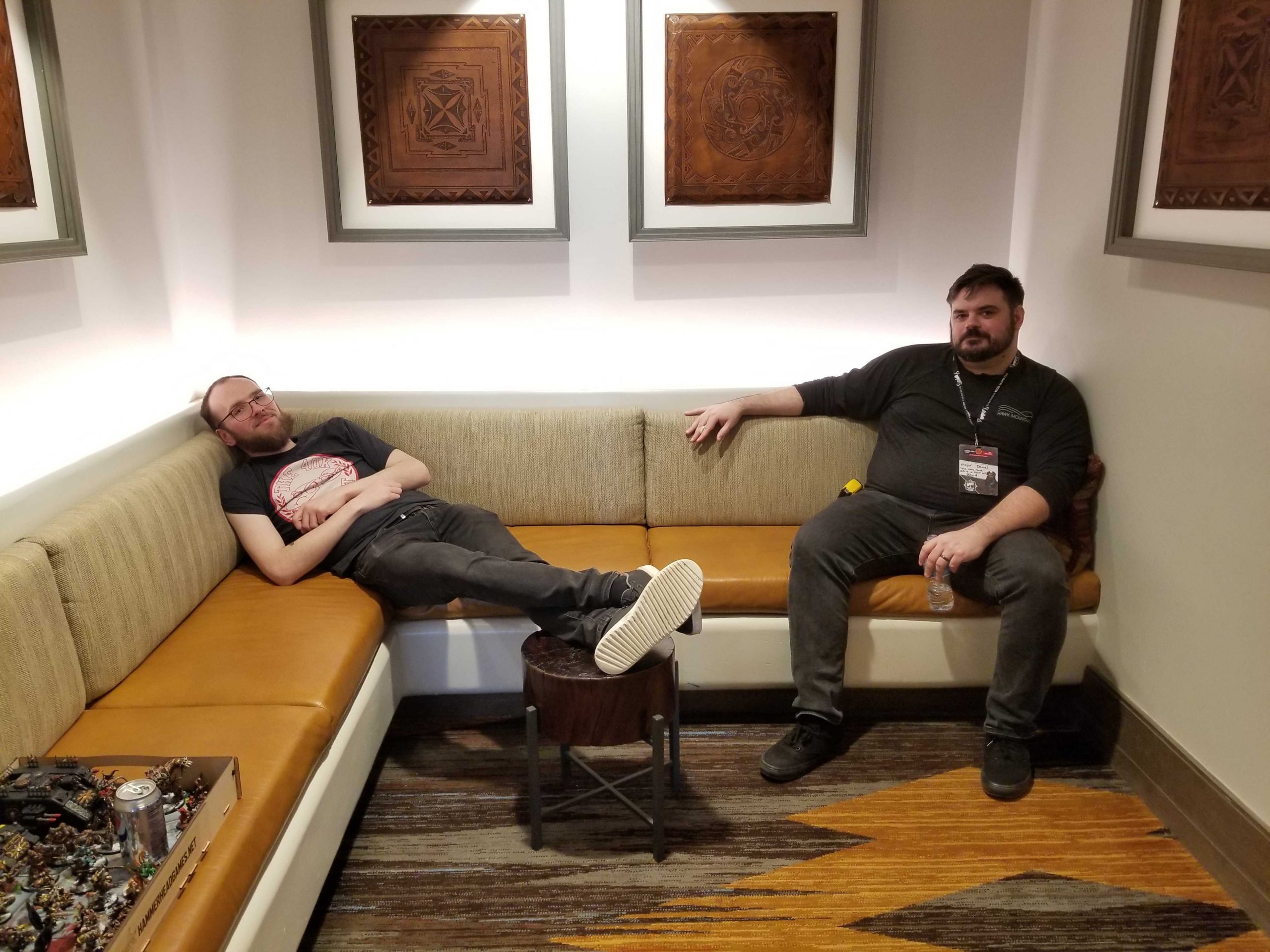 After the games it's time for hang-outs. We meet up with a bunch of people in the lobby, including my wife, and hang out and eat dinner. The bar is full so we end up getting food ordered "to go" to the lobby, and I'll end up eating basically a plate of brisket nachos for dinner along with a fried green chile, which was surprisingly solid. We hang out for a while and talk about our games, then it's over to the Preview event and Day 1 briefing.The preview event has already been covered online. They ask us not to take any photos, presumably because the quality would be "shitty phone taking a screen shot of a powerpoint slide 50 feet away," but almost everything they've shown has made its way online. I say "almost" because they showed us Angron's statline, though I was too far away to read it. I'm pretty sure he has 18 wounds, though. Anyways it was a cool reveal, and it was neat to finally see more of where they're going with Arks of Omen. We'll have more to say about that in the future, though.