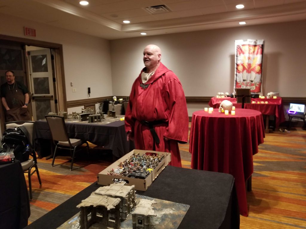 The ministorum representative in the Sermona MagnificatThe second round sees us being deployed to Sermona Magnificat, a shrine world where we've been tasked with smashing through enemy lines to push toward the capital city. This room is more dimly lit, with cityfight boards and faux candles that give it an appropriate feel. The actor leading this room is an Imperial priest who recites litanies and blesses the imperial players. He's legitimately the best part of the event from a staff/actors standpoint, and his mini-arc over the three days is the highlight of the event.