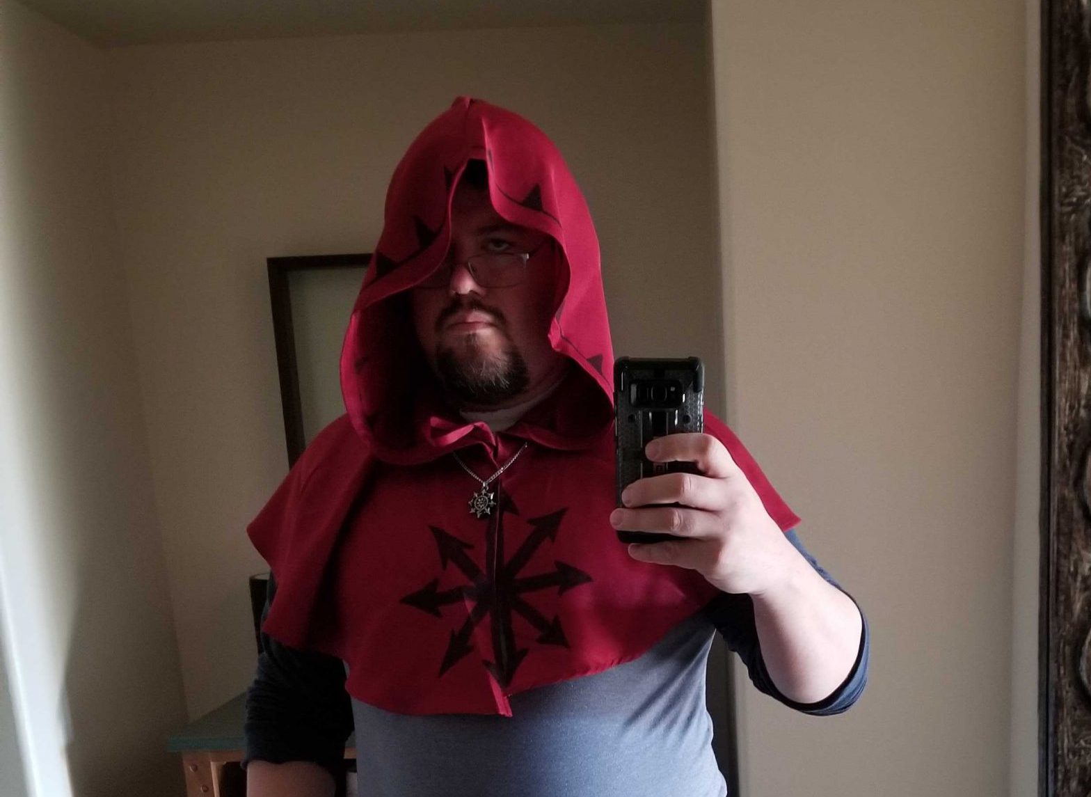 I am not a cosplay guy. I've been known to go really hard at halloween with makeup but generally speaking it's not really my thing, since I'm much more into being comfortable, especially over the course of an entire day. Plus wearing the same clothes for three days isn't my jam, either. So my idea for the narrative was to just do something simple - a cowl and maybe some prosthetic horns, something that could slip on over my regular clothes and give the right idea but wouldn't be to obtrusive or uncomfortable and wouldn't be something I'd sweat into.