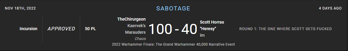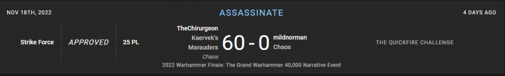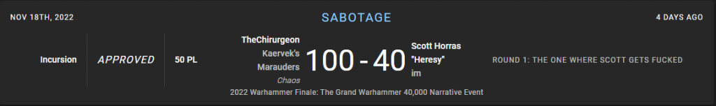 I get matched into JD "TheArmorOfContempt" Reynolds, who you may recall is one of the best Kill Team players in the world. He absolutely crushes me with his intercessor team, in part because he just lobs grenades at me on turn 1 and scores 11 critical hits on me, killing one of my operatives and injuring two others. The game is over pretty quickly.