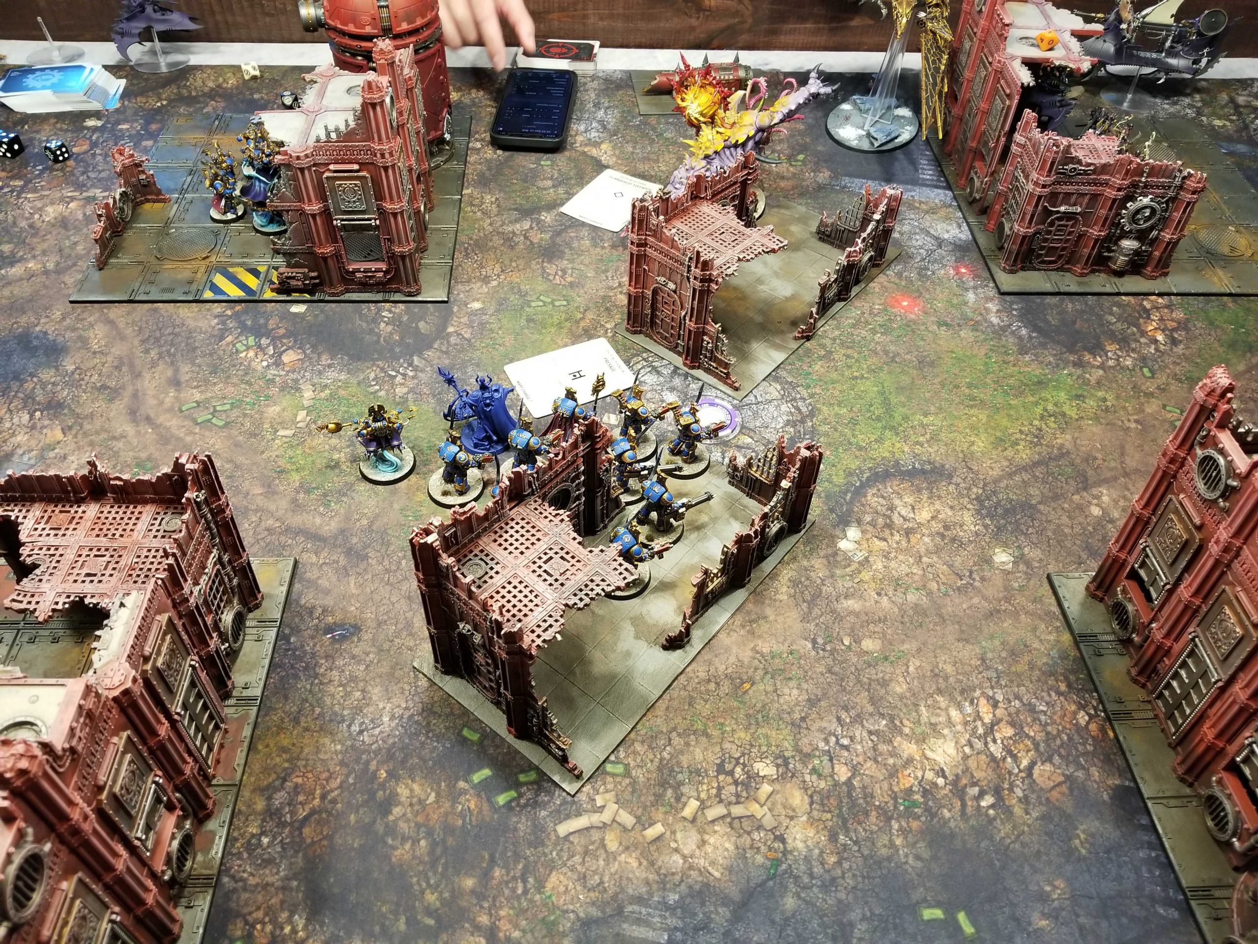 I used my warpflamers to teleport and kill a unit of Warp Spiders, and made a best-try attempt to take out the Avatar. Unfortunately Erik spiked his feel no pain rolls and ended up only taking 6 mortal wounds on him, and then laughed off the Daemon Prince's attacks. He struck back, getting a single unsaved wound in, only to roll a 6 on damage, killing the DP outright. Great.
