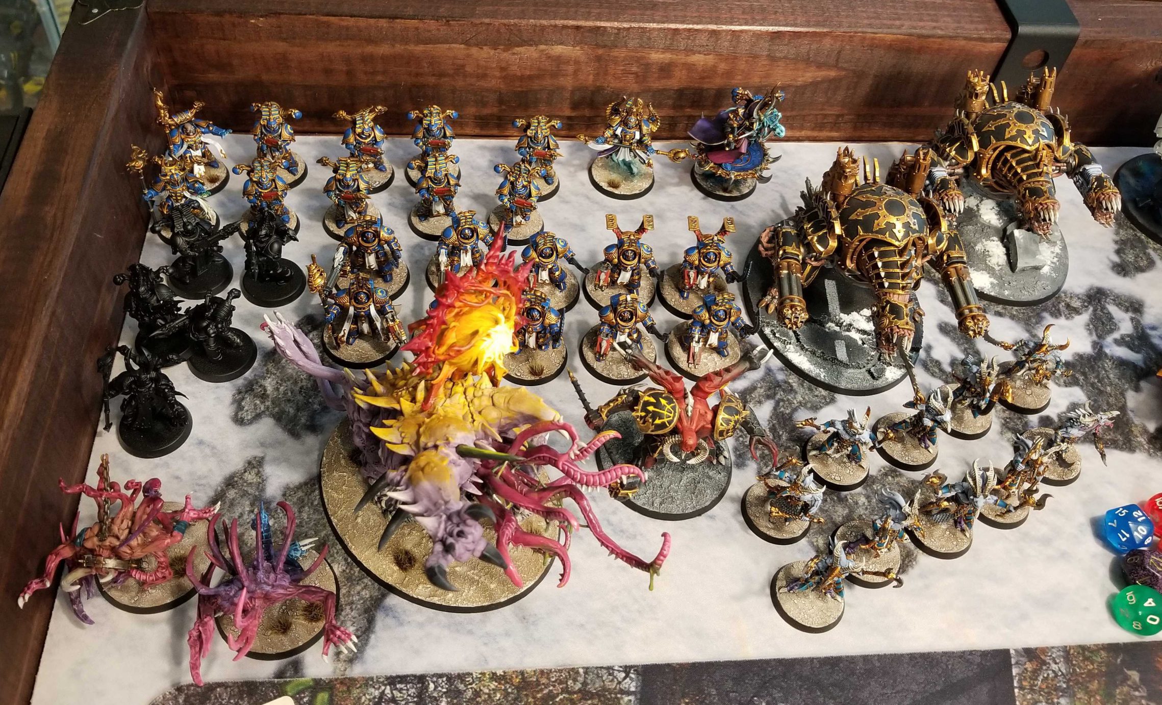 The general play here is to use the Scarabs and Mutalith for mid-table objective control while the Forgefiend offers ranged support and the Heldrake slows key units by tying them up early on. The list can also do Engage fairly well as the rubrics can teleport around the table as needed.