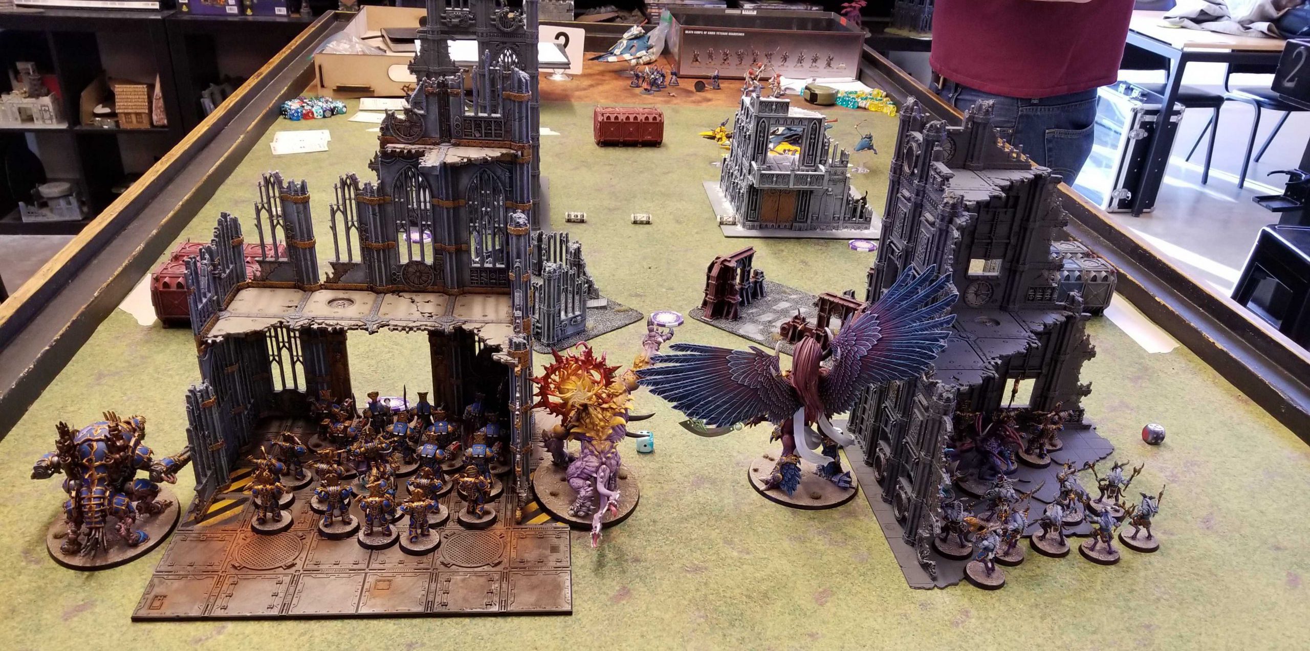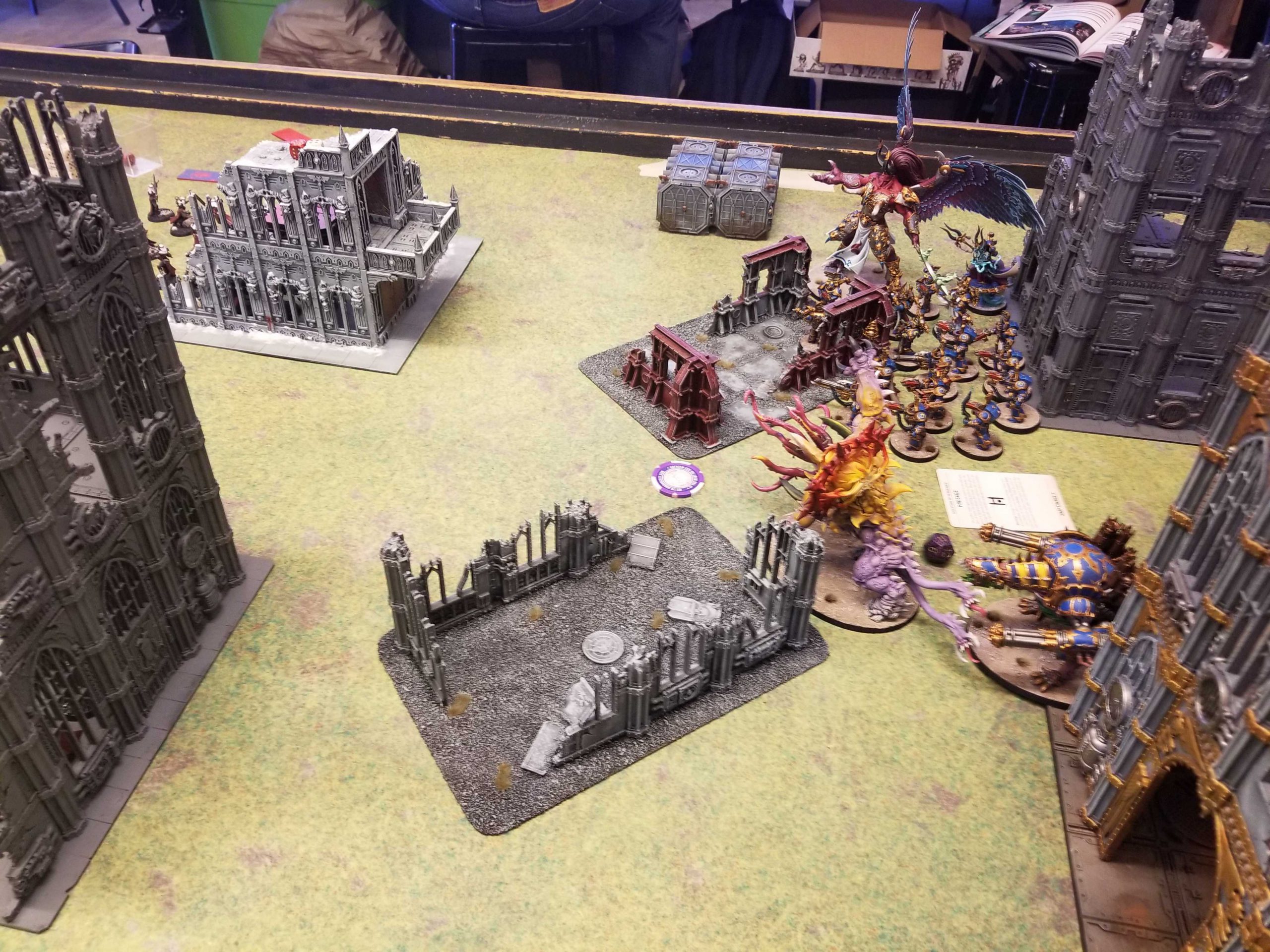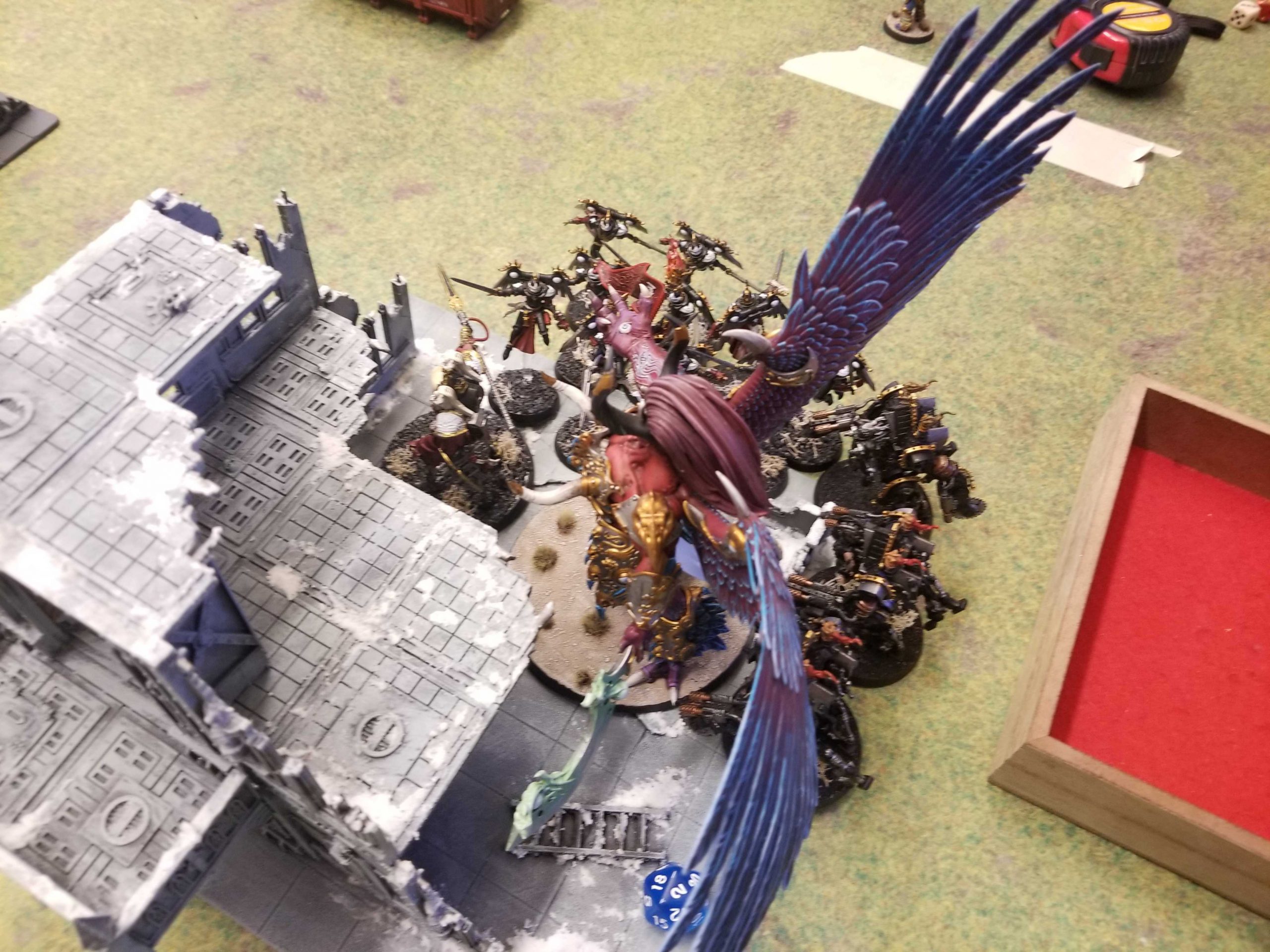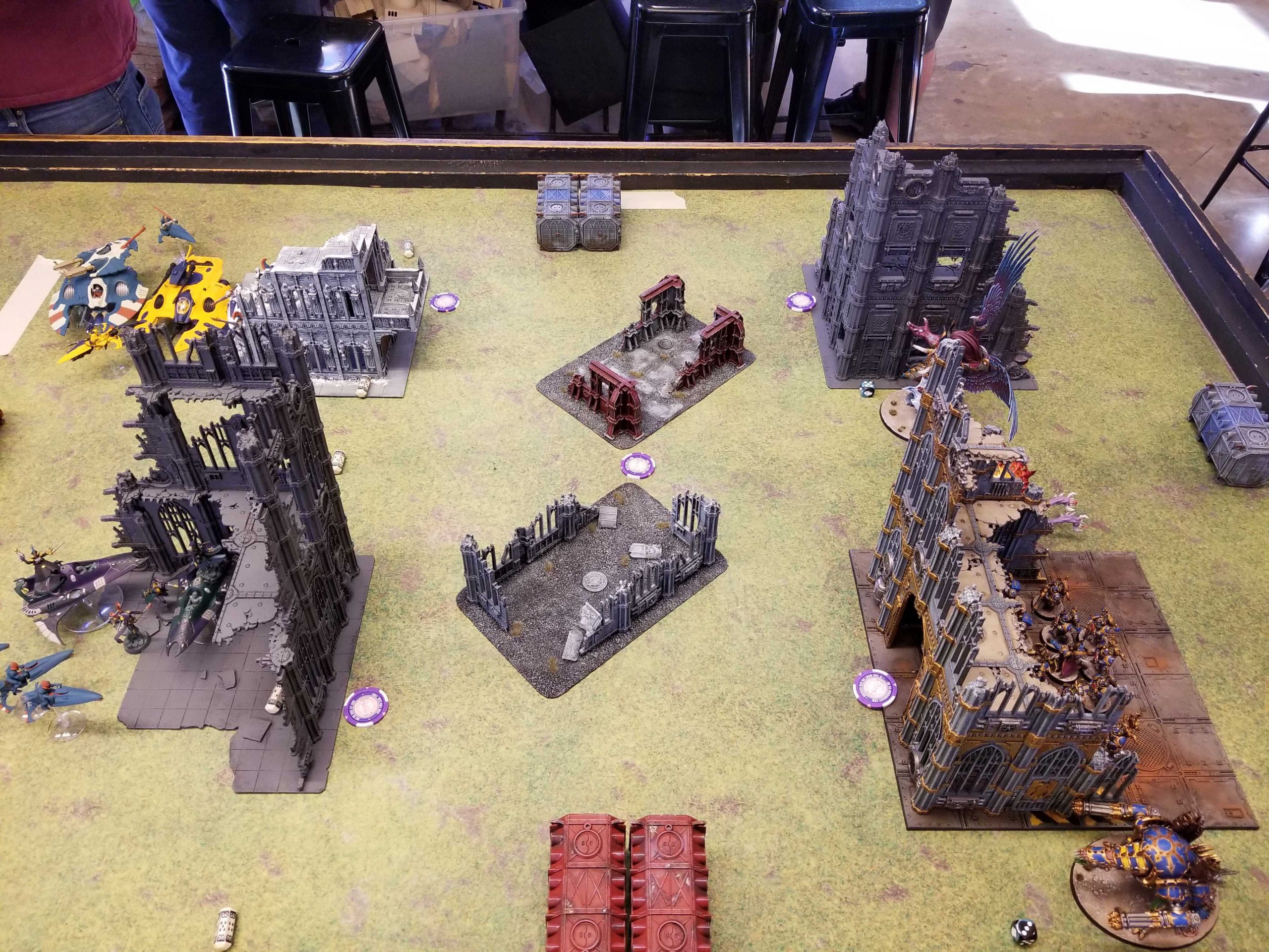 On the other side of the table I took advantage of Joel pushing forward with his Harlequins to drop in behind him with a unit of Scarabs, who promptly shot a unit of Skyweaver Jetbikes to death and proceeded to sweep forward and take the objective in that corner. Caught between them, a forgefiend, and advancing Ahriman and Rubrics, Joel's Troups in the center didn't last long, though part of this was that Ahriman got lucky and tanked a bunch of Death Jester Shots to survive on 2 wounds.