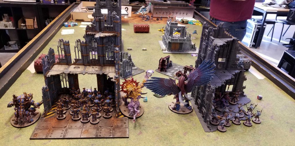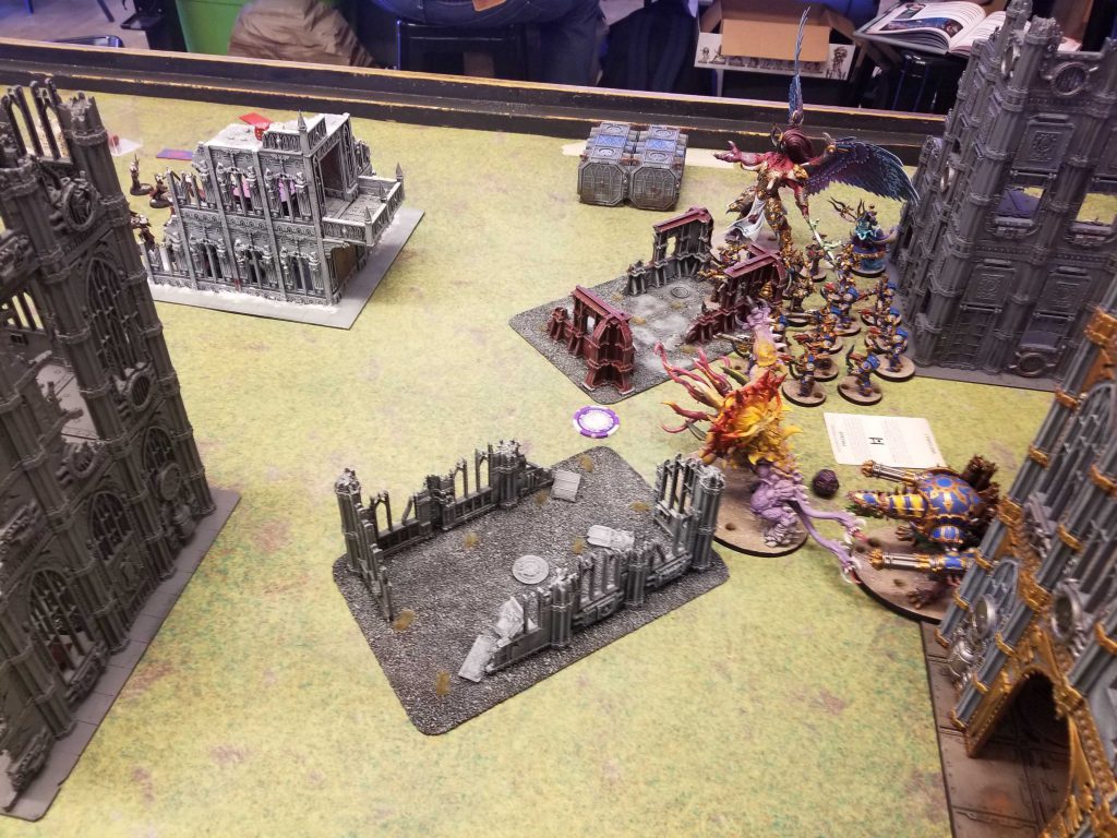 Not as bad as it could be. Ryan spends turn 1 advance moving and pushing a unit of Sacresants into my Risen Rubricae unit at mid-table, but uses his Rhino to eat overwatch and that prevents the Sacresants from being able to fight with more than a few models thanks to the terrain. In the following turn the Rubrics fall back, heal up, and I mortal wound the Sacresants into oblivion. Meanwhile Magnus rushes to the bottom right corner and spends most of the game clearing out units over there, including a unit of sacresants, novitates, battle sisters, penitent engines, Vahl, and some Seraphim, mostly by spiking saves and healing every turn, then pooping out 3D3 mortal wounds with an un-deniable Smite. Good stuff.