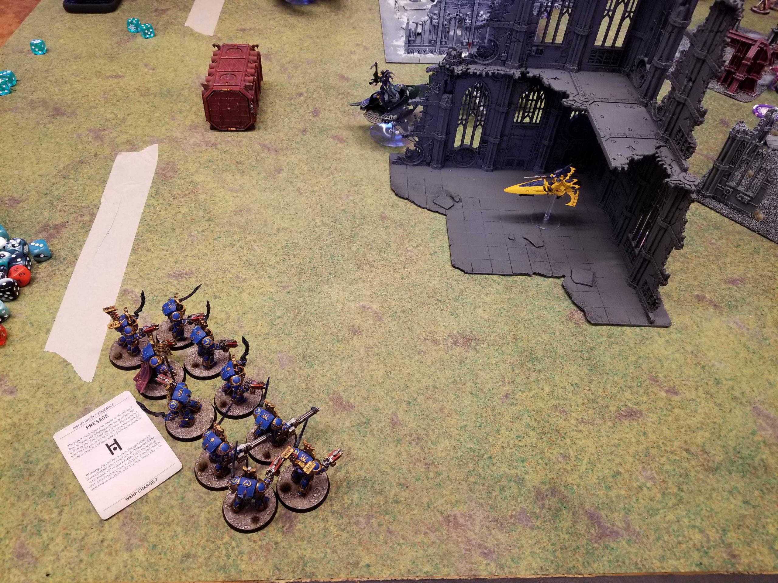 That's just fine by me. Easier to score Wrath of Magnus. I need to screen out the Falcon full of Banshees but that's basically my biggest concern. Joel spends T1 with most ineffectual voidweaver shooting that only kills a single Rubric marine, then we're off. I dart Magnus across the table to the south and use him to wipe out a unit of Shining Spears.