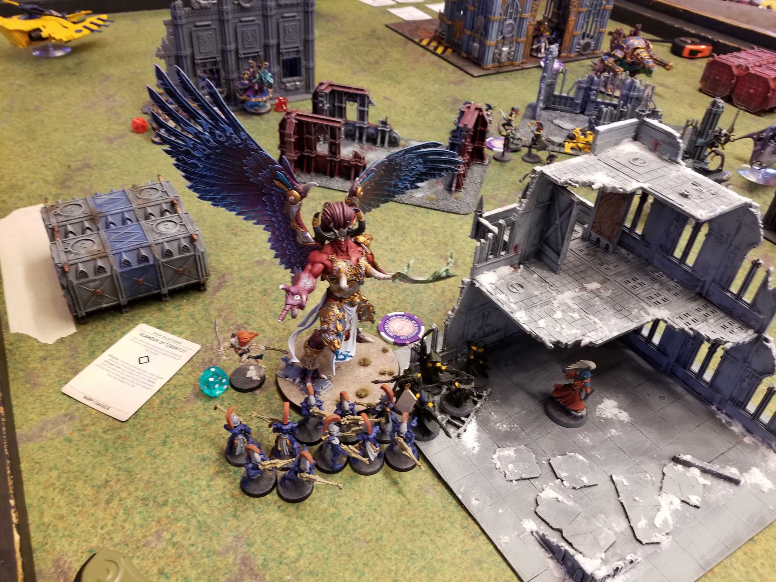 Magnus will spend most of his game over there, fighting off and killing Banshees, Rangers, a Warlock, and a unit of Dire Avengers before he finally gets dropped by a Falcon. Mostly this happened because Joel kept undercommiting to killing Magnus, trying to split fire and save shots for other units. Magnus kept surviving on 1-2 wounds, then healing back up to 4-5 with Temporal Manipulation or Warped Regeneration, depending on which I needed. By the time he was finally brought down I'd successfully held off a third of Joel's army for most of the game.