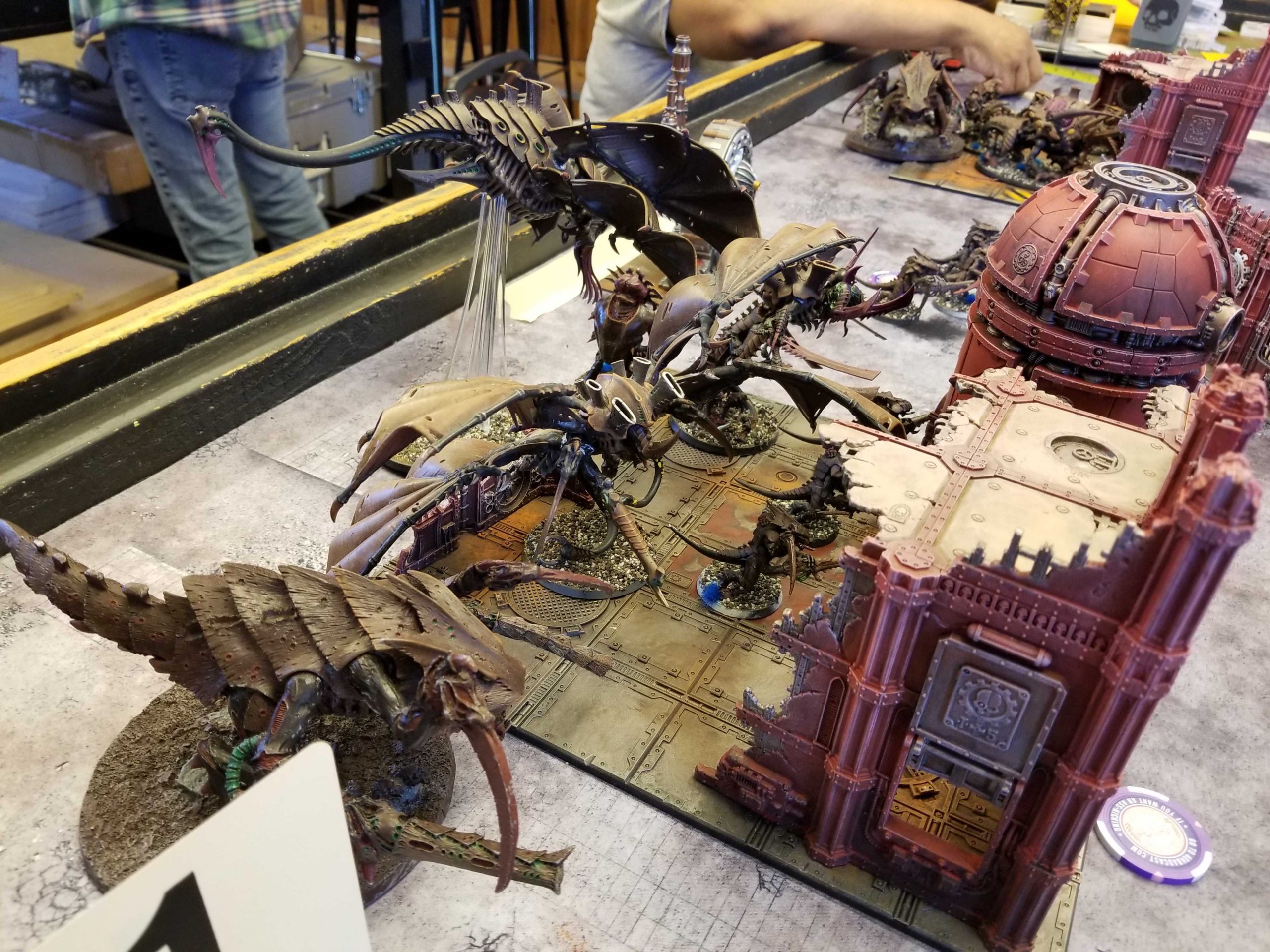Dear Reader, it did not, in fact, matter. Sean never even moved to hold that objective the rest of the game, starting on 9 CP and never getting any more. This meant his Hive Guard could only shoot twice. He could have moved the Heirodule over there but instead just ignored it, losing out on VP - only holding 1-2 objectives most of the game. Magnus manages to survive longer than I expect, but is also just mostly ineffective at actually hurting things and while I manage to kill the Harpy, Maleceptor, and Swarmlord, that's all I manage to bring down, only scoring 6 on Bring it Down as the final Heirodule manages to tank several final attacks to survive on 2 wounds.