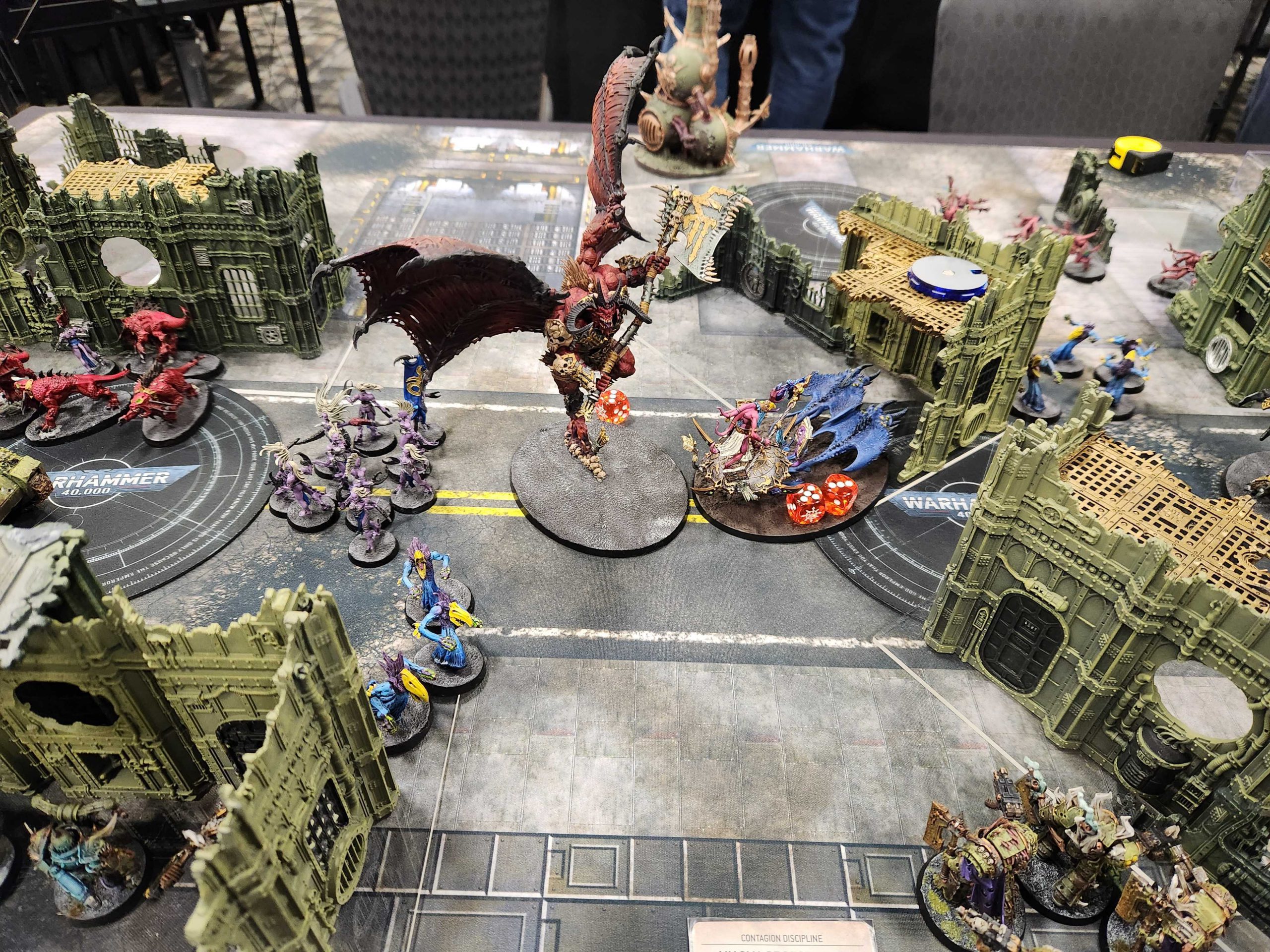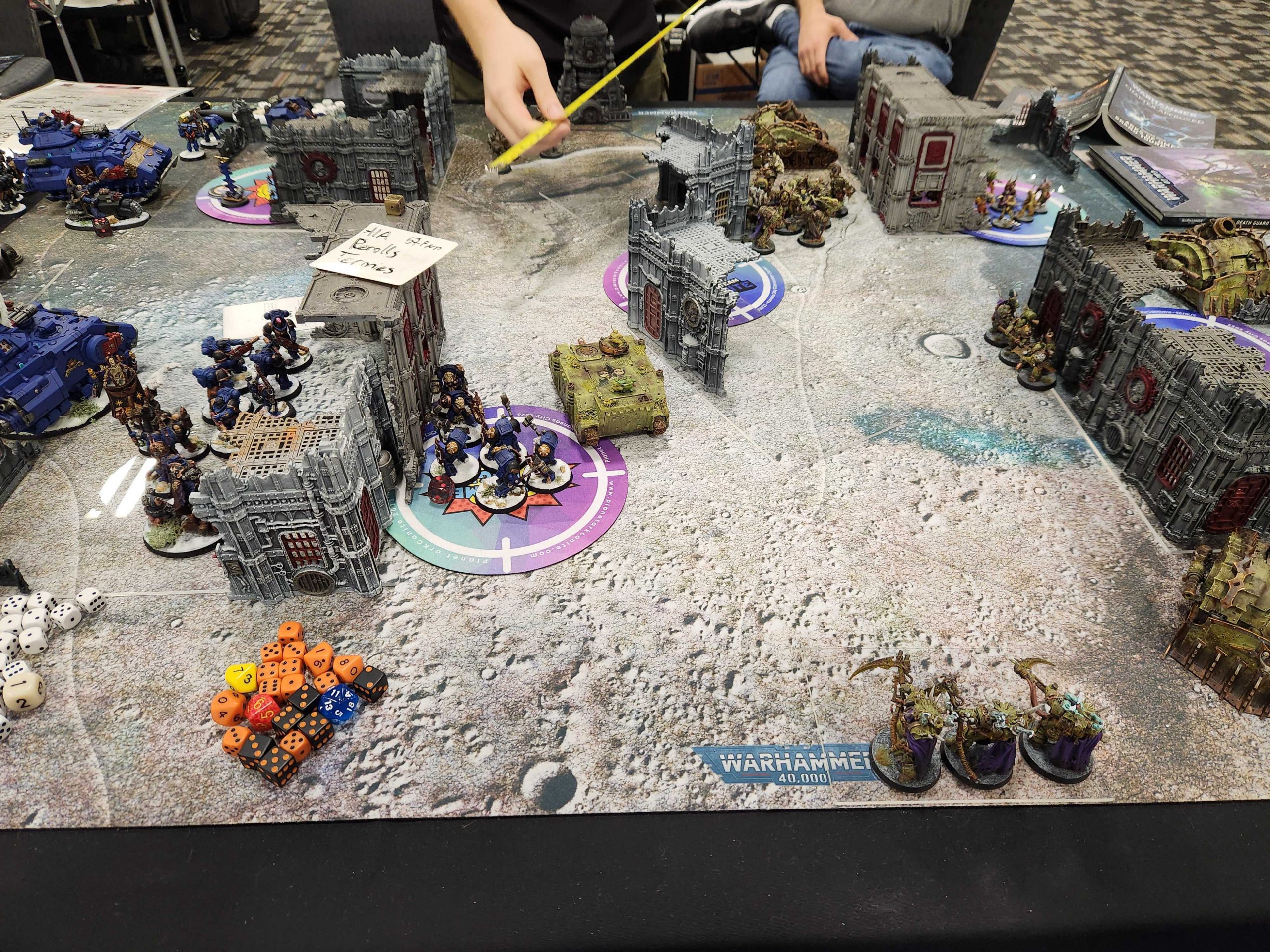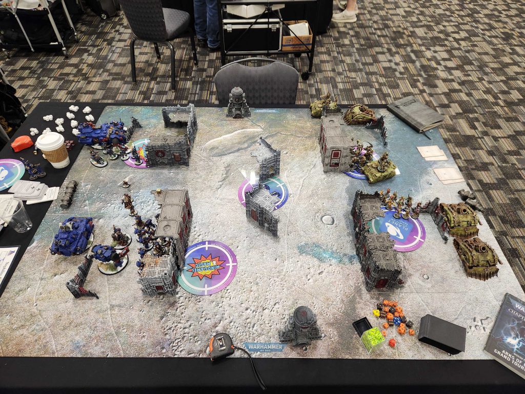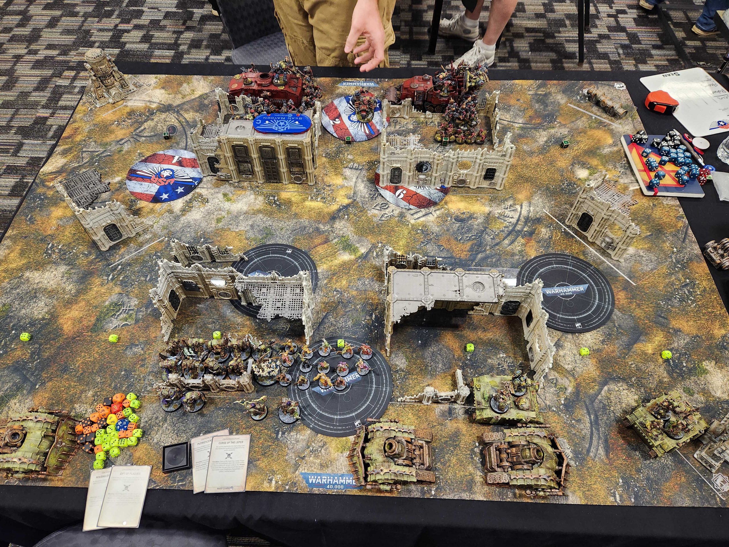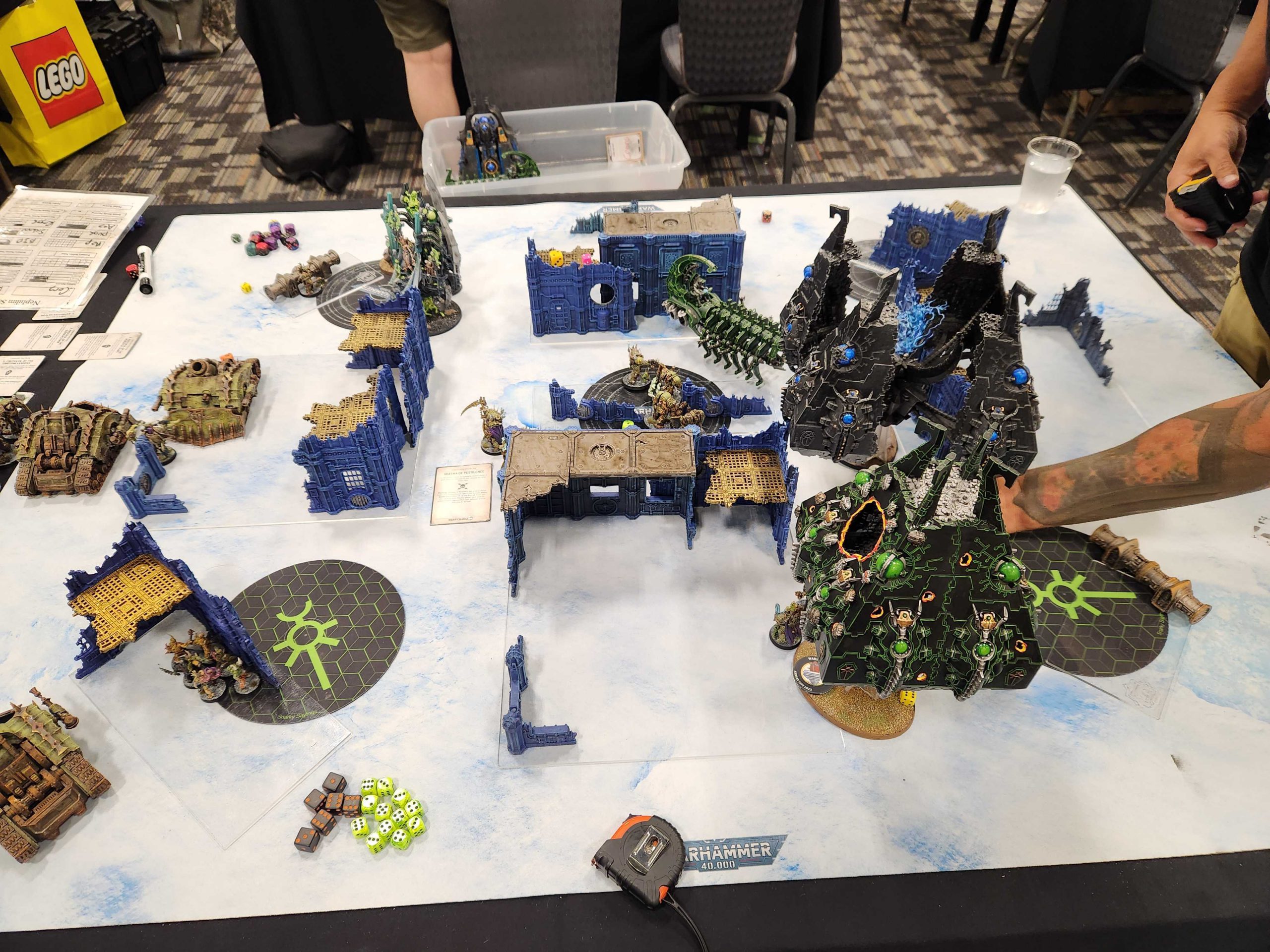 Before the game, the judges inform us that we need to rotate the terrain on the table (they will later reverse this decision after we've started playing), and that doesn't cost me the game, but it does massively tilt it in Erik's favor by giving him easy hiding for his entire army until I can force him to come out. Add in some early 11+ cast spikes on his Infernal Gateway to wipe out my terminators/characters in a spot where I can't really hide and Erik making all of his deep strike charges and there's not much left I can do but try and score as much as possible in a loss.