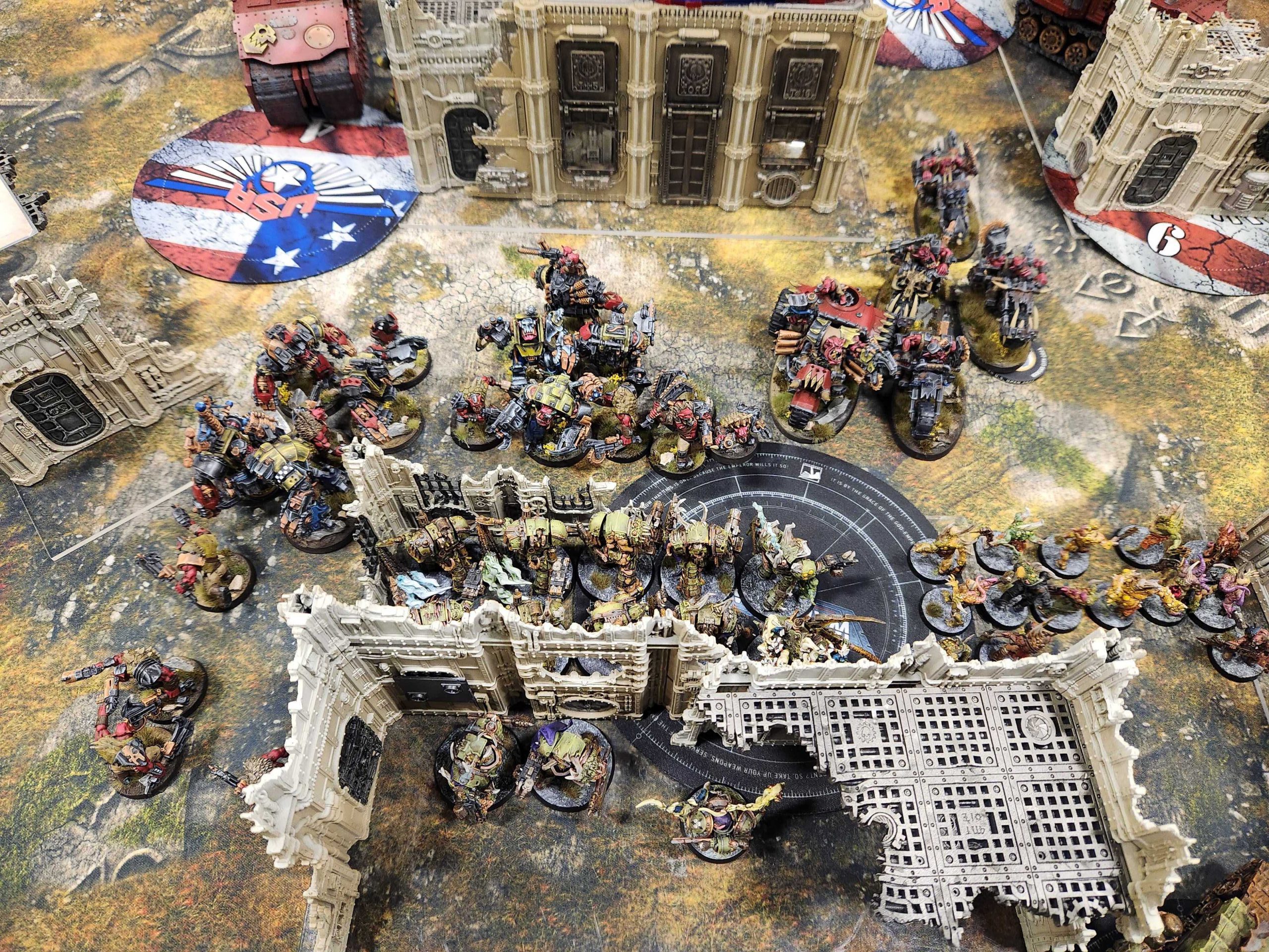 Deployment vs. Nayden's OrksThis is pretty rough for us but I think this is the best-case for our pairings. Unfortunately things don't go our way and we also get outplayed on a few tables. Norman does his part to keep things close but Scott loses the first-turn roll-off to Jamie and Goatboy loses his first turn roll-off to Quinton and those games go the wrong direction.