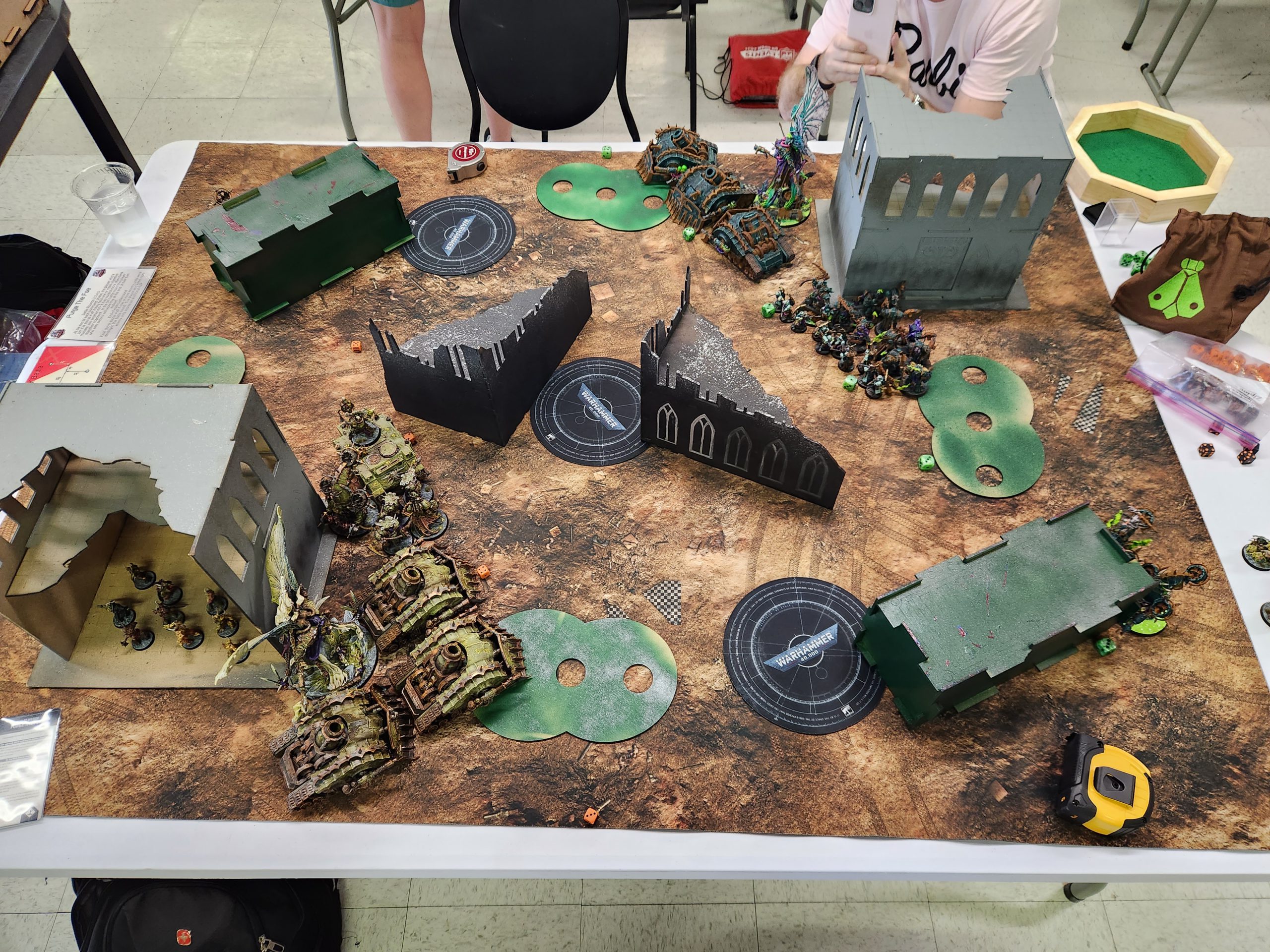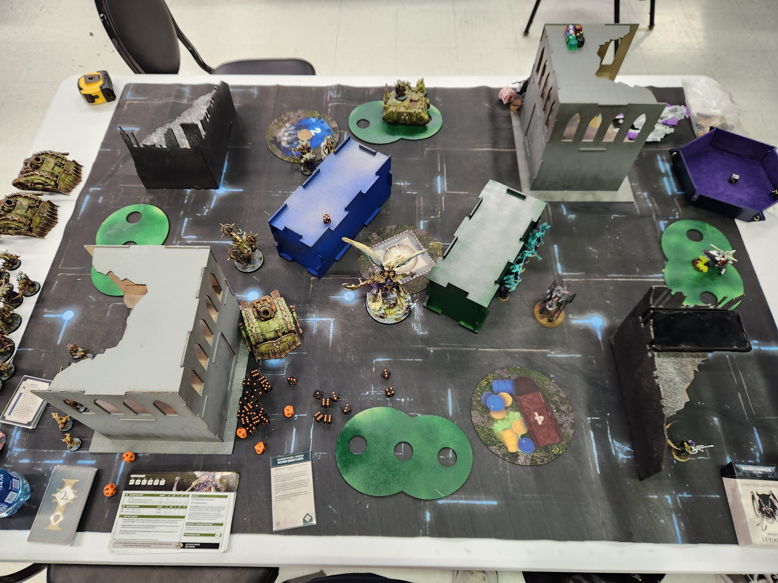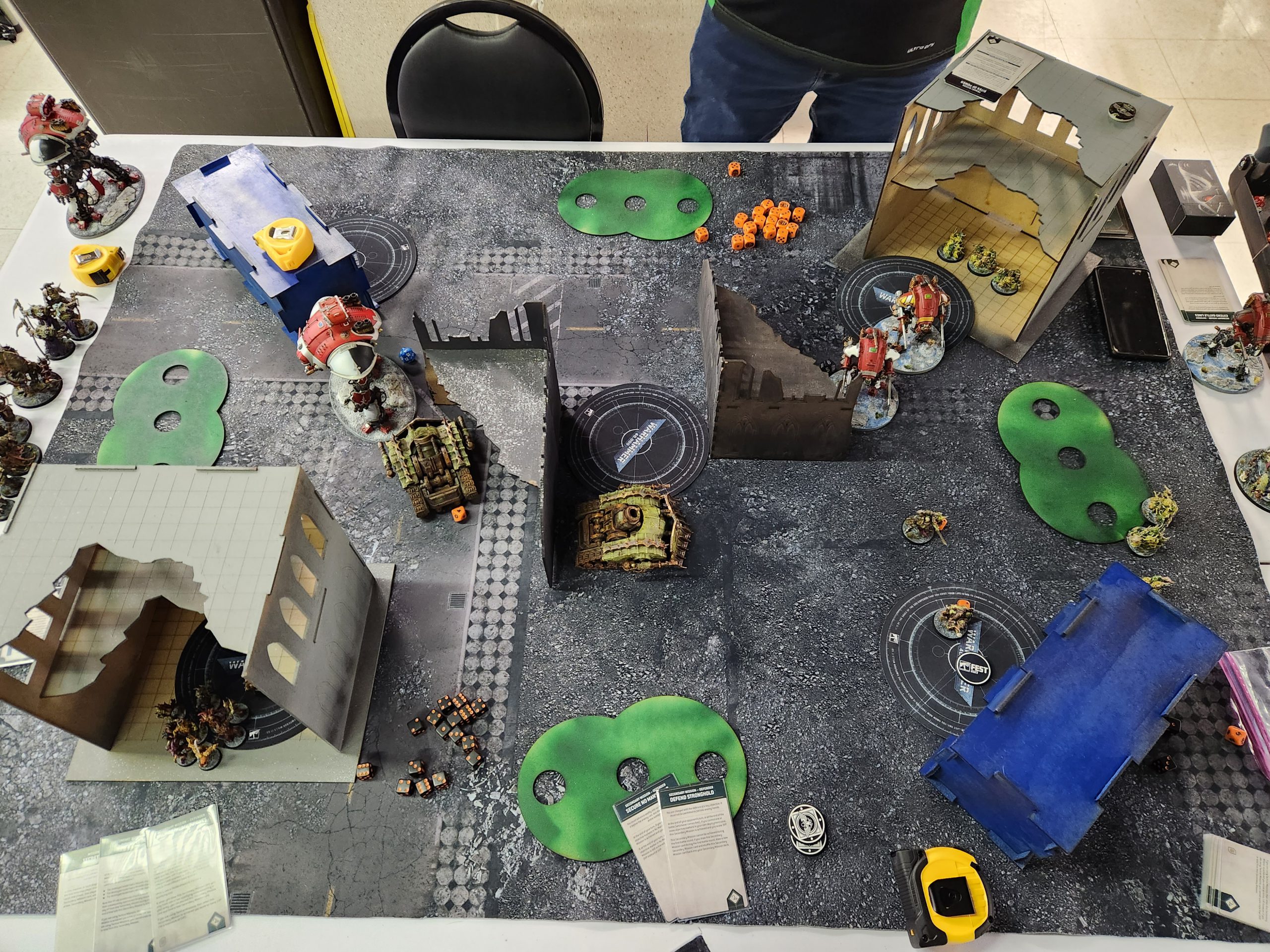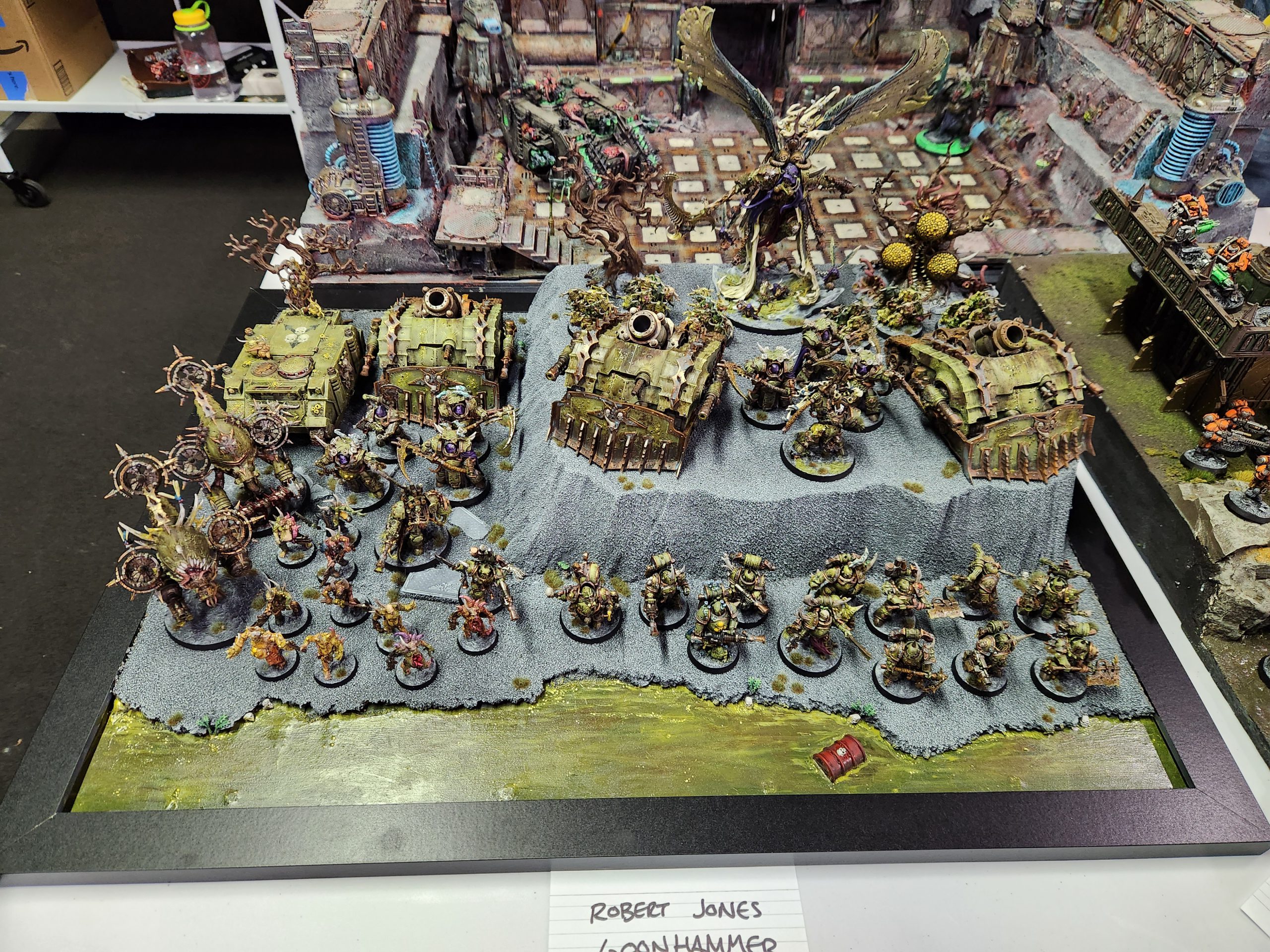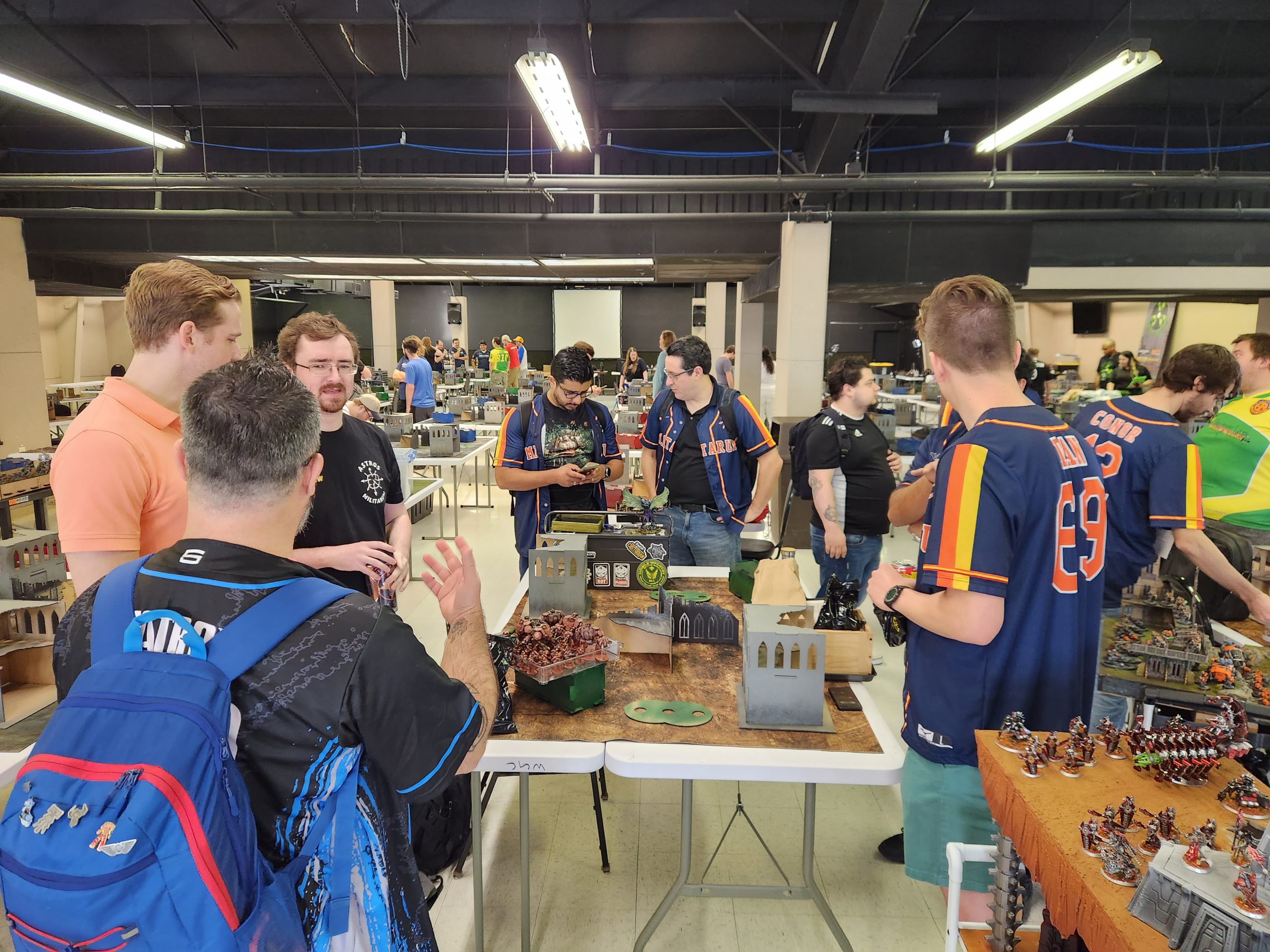 Steven's a joy to play and puts up with my bullshit very well. This game came down to the wire and I legitimately thought I had lost it when my Chaos Lord died to Overwatch there but I wasn't paying close attention to the secondary scoring and Steven just didn't have anything left in his deck he could draw to make up the difference. We'll end up cursing the Cowboys' piss-poor play together against the Cardinals the next day as we watch the game on his phone after round 6 ends.I take my army back up to the paint judging table for submission. They didn't have time to make it through every army with the shortened lunch and I'm happy to throw my hat in again. My Death Guard aren't my prettiest army but they look decent with Mortarion and I have a display board so I may as well use it.