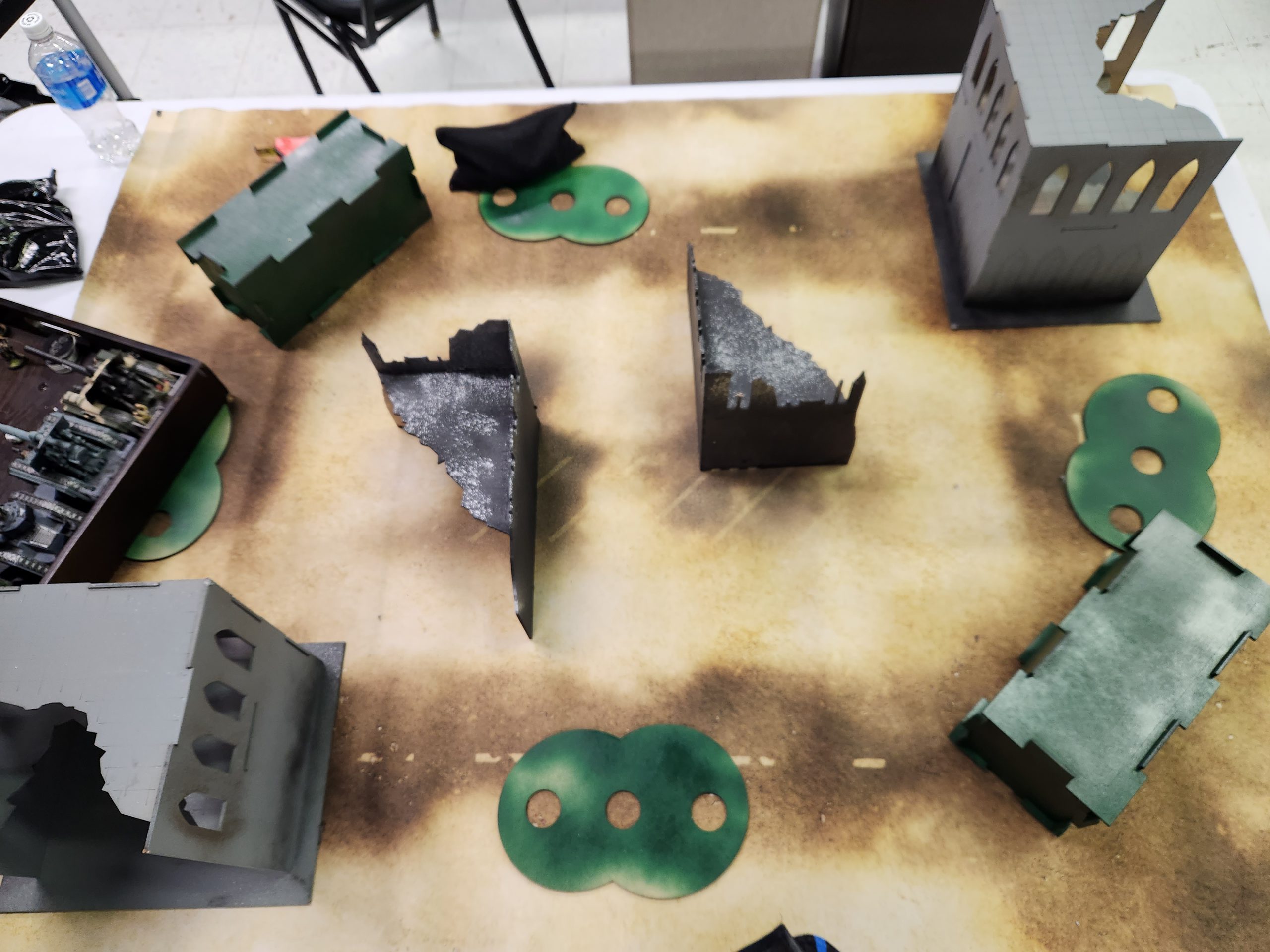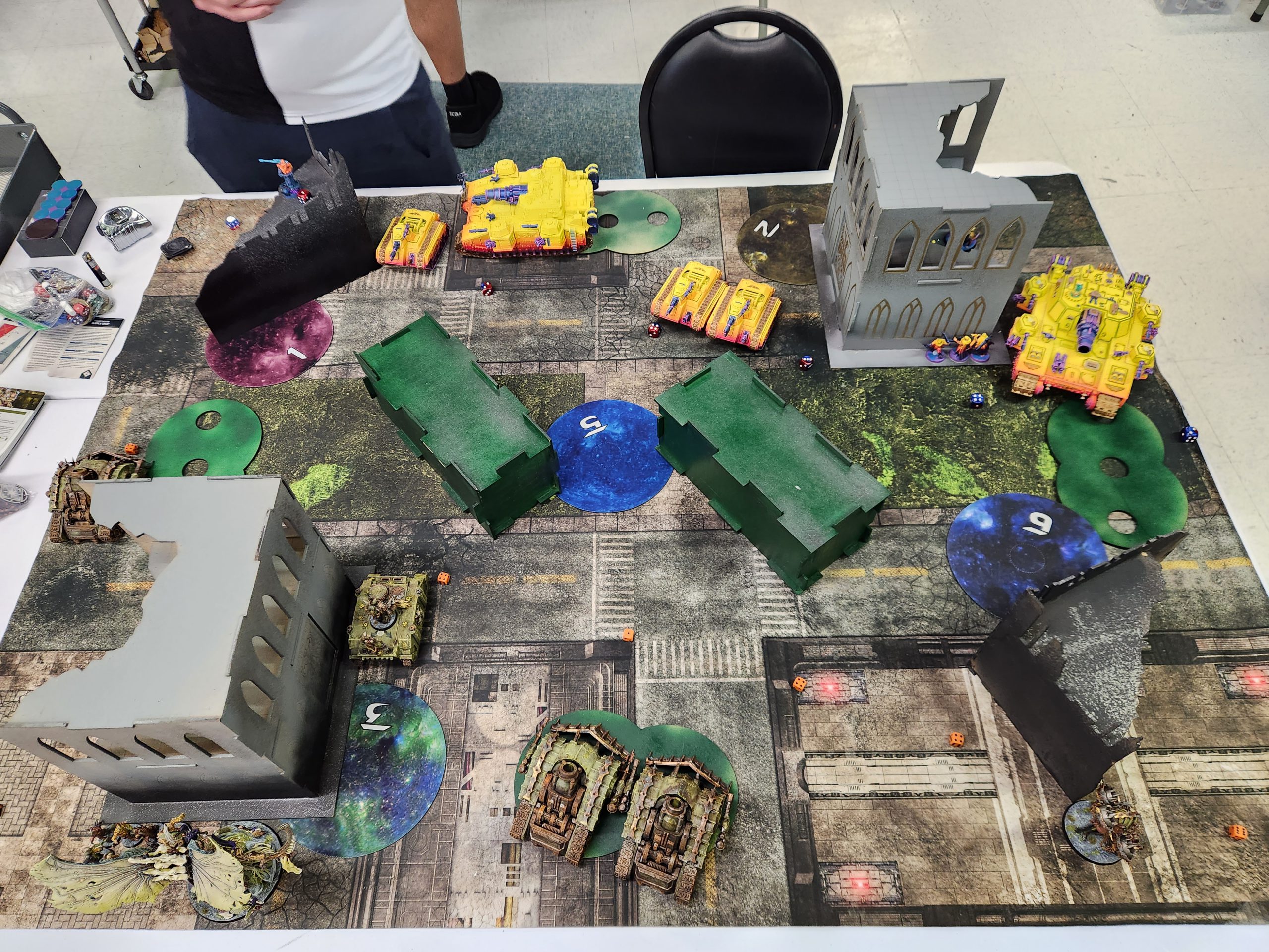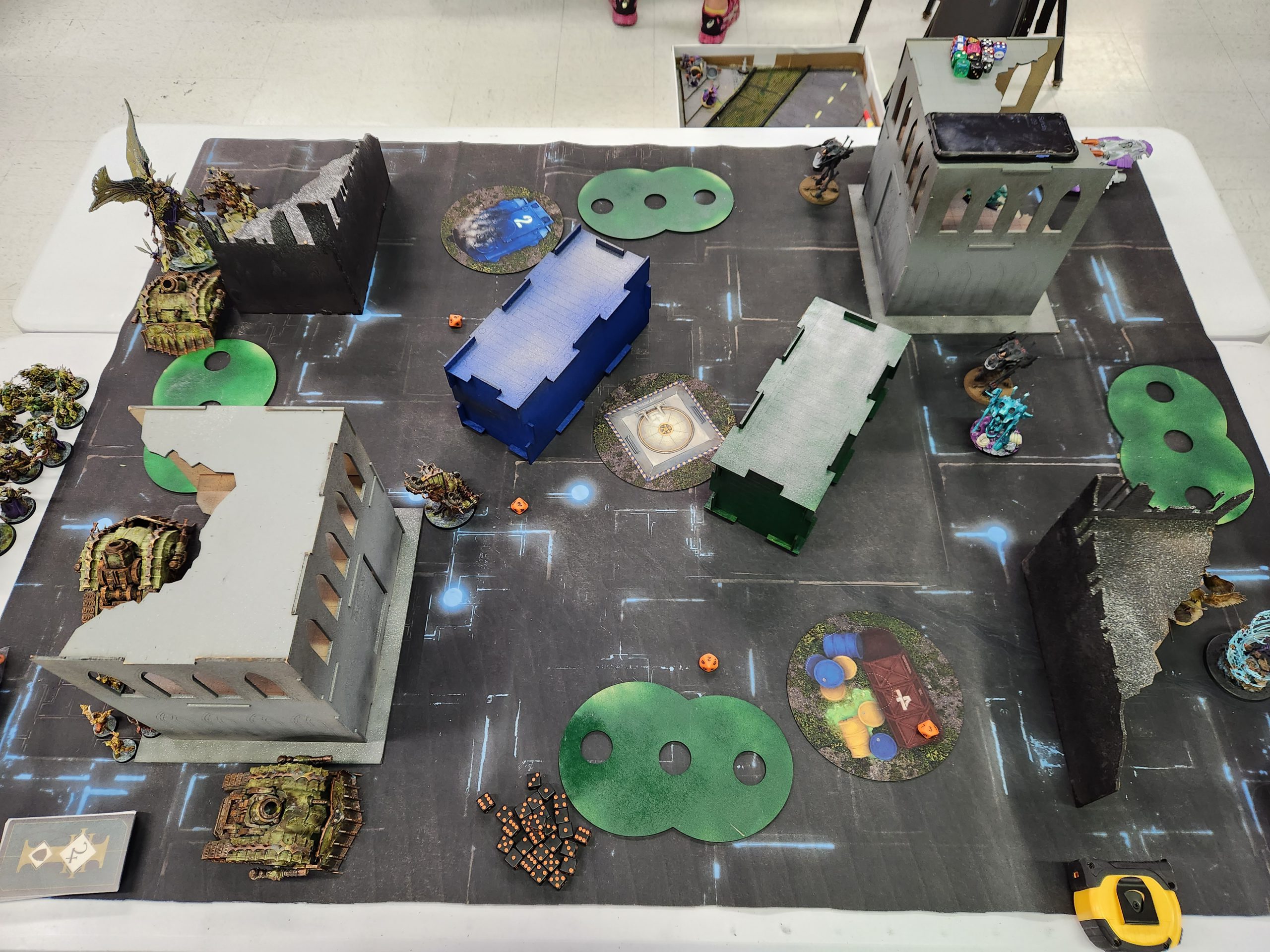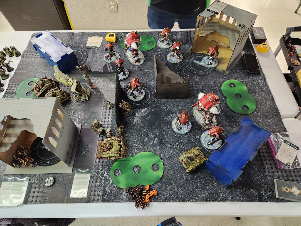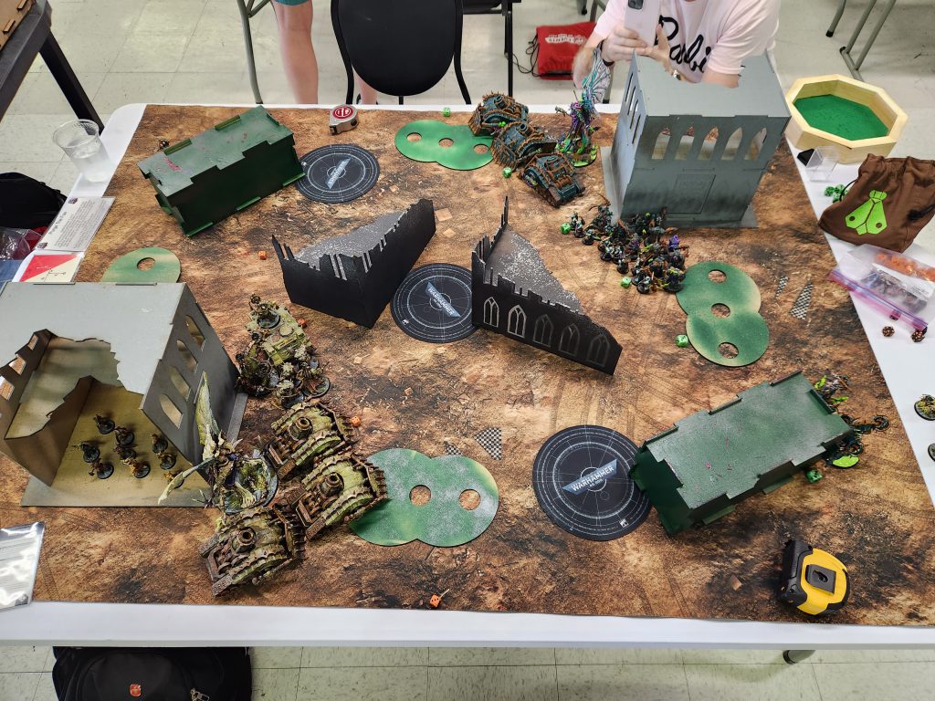 Those two L-shaped ruins in the middle are Ruins. On Sunday? They've swapped places with the crates, which are not ruins, i.e. Obscuring. This means that the middle of the table is just wide fucking open, turning the board into a shooting gallery. It's also way harder to get through the middle of the table. The event didn't have great terrain, but it was close to serviceable on Saturday. This Sunday layout sucks shit.