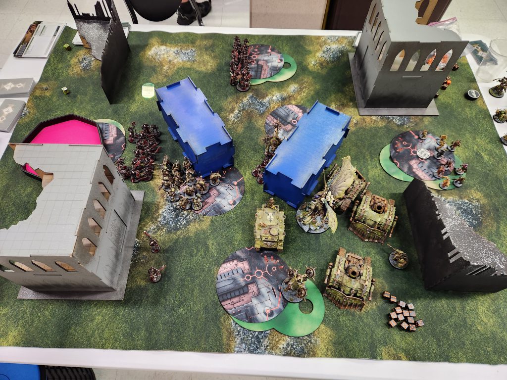 In an absolute windfall, I get to go first for only the second time this event. Holy shit. I roll forward with the Lord of Virulence, speed forward with the Rhino and drop out the plague marines, then proceed to light up the warrior blob with anti-infantry shooting followed by every mortar. I kill the entire unit on the first turn. On Kevin's turn, he ambles forward with the Lychguard, and I overwatch them with my Plague Marines, killing 4 of them plus the two thralls. Then he charges my unit, and they fight first, killing the remaining 6 Lychguard and the Overlord. That's basically game, and we're done before turn 2 really gets into it. I take out the Tomb blades and Flayed ones, can mostly ignore the other Lychguard blob, and the Heavy Destroyers won't be too big an issue when they arrive.