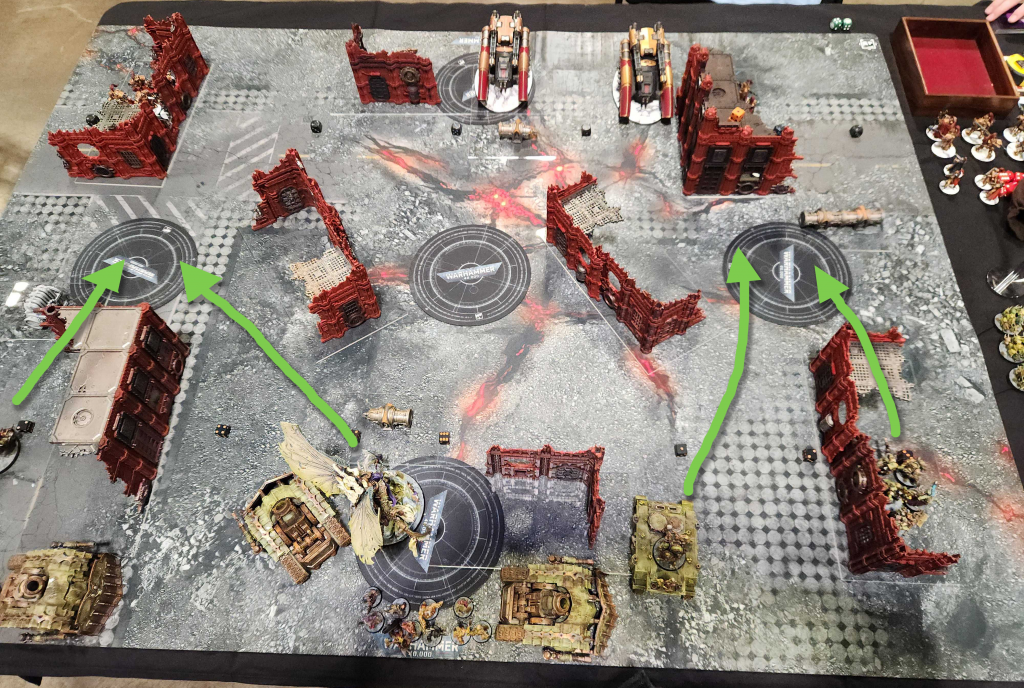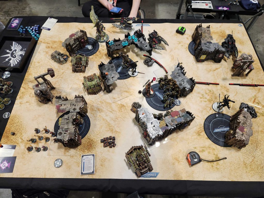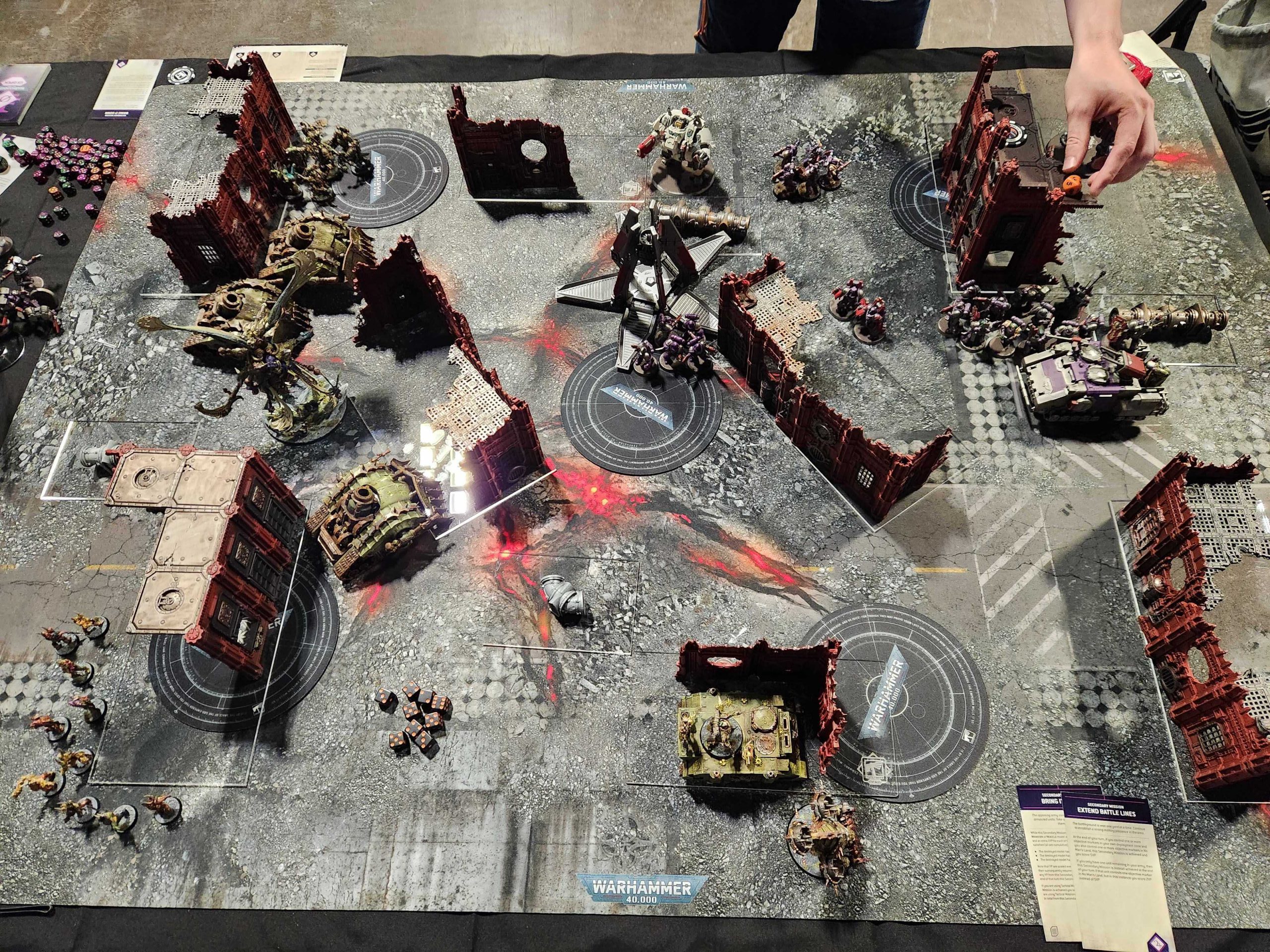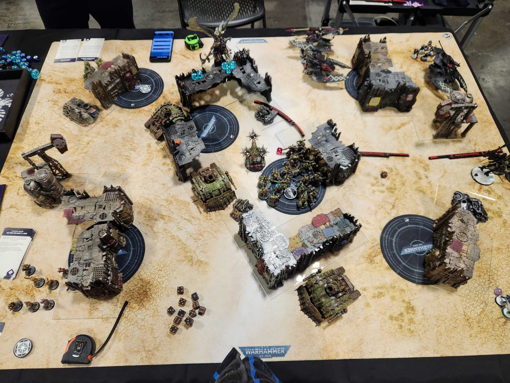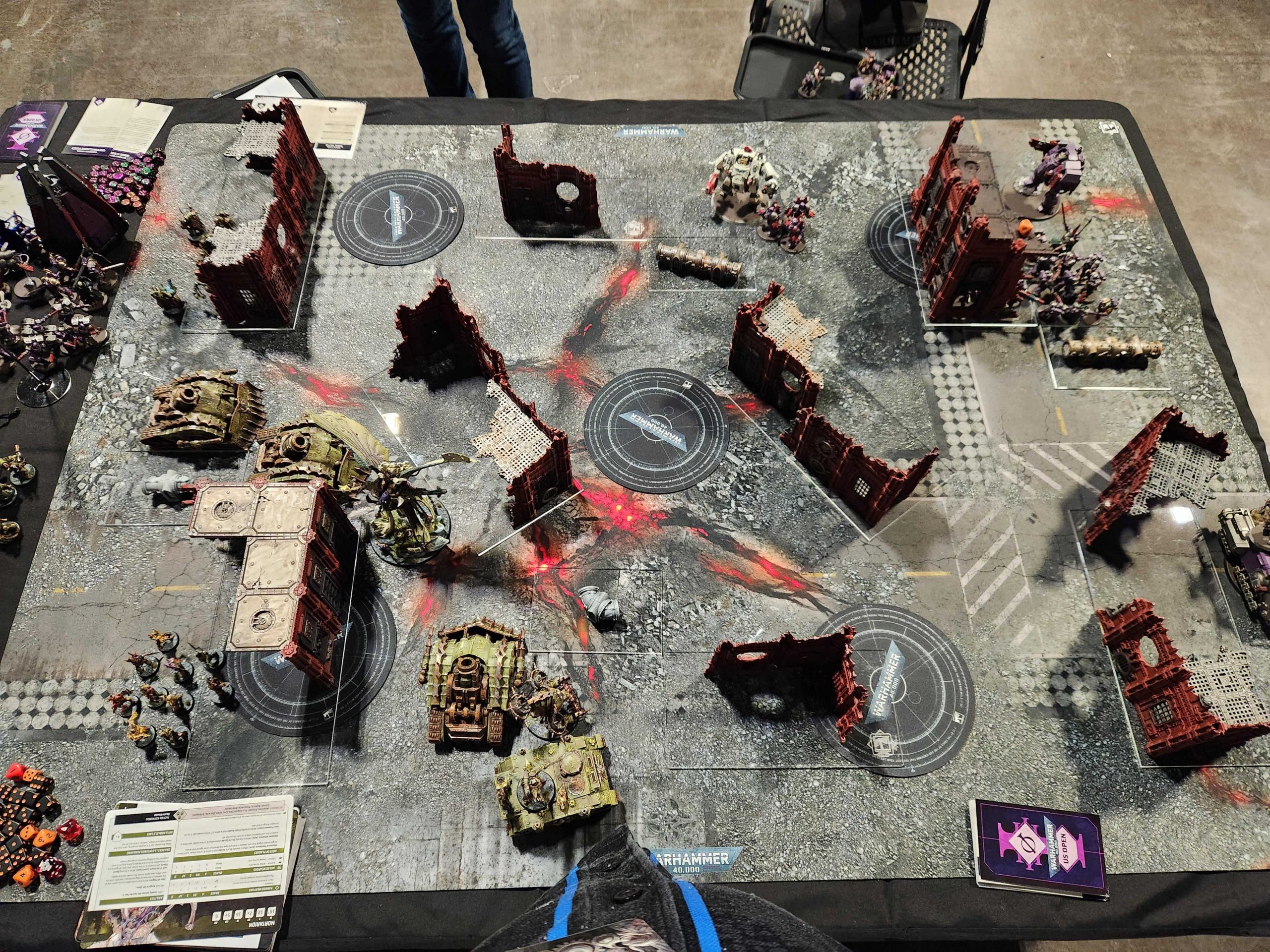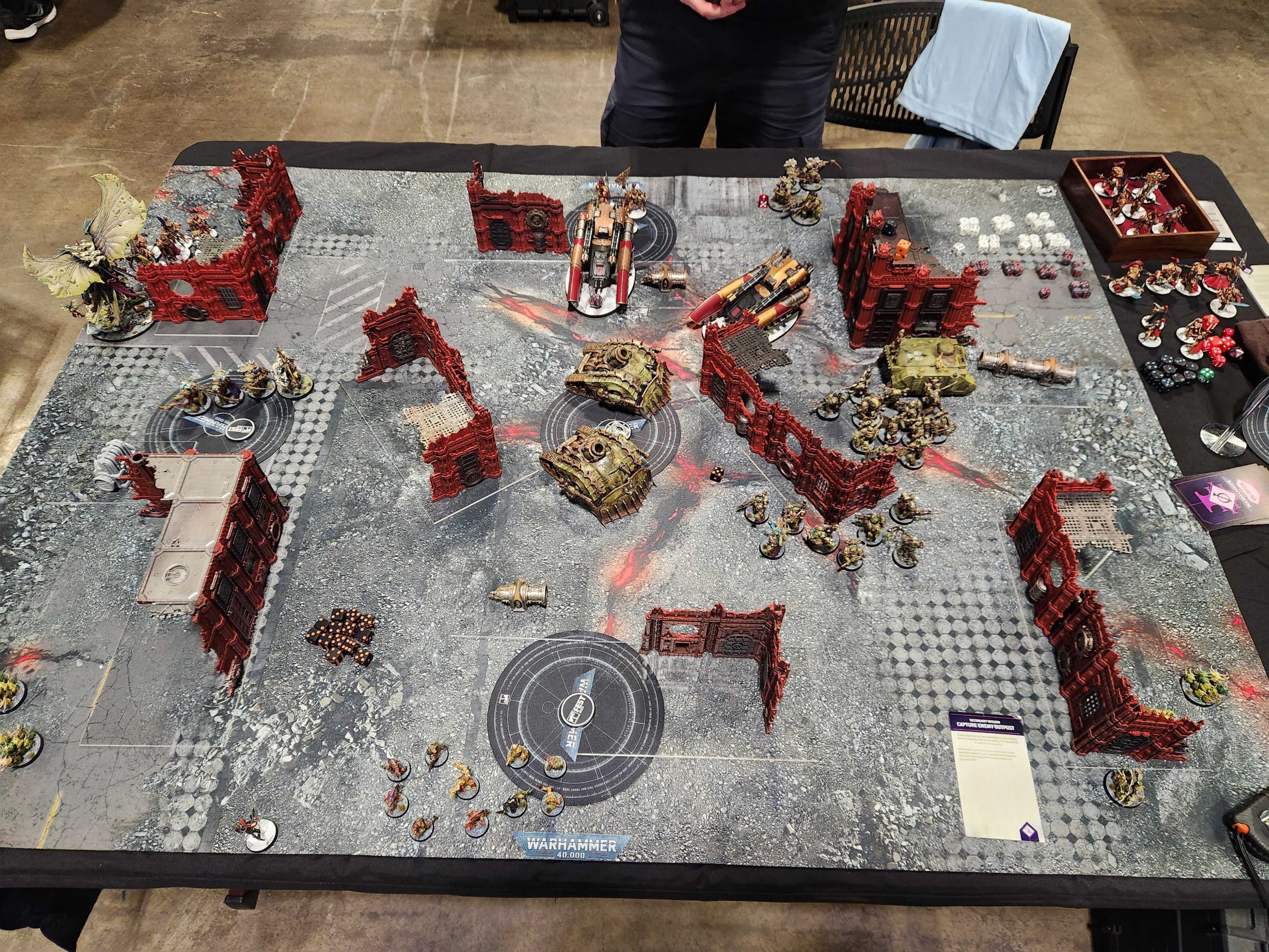 Xander was another great opponent and a fun guy to play. The big challenge here is that his list was just unoptimized and I've already played multiple practice games against Aeldari, both with Ynnari and the Avatar and both. GW's terrain layout here made it easy to avoid the Fire Prisms early and even without first turn I'd have made short work in this game as Xander's army had lots of tools to play objectives but not enough of the units he needed - Nightspinners, Spectres, and Wraithguard - to take out my heavier units.Round 3: vs. Ashley Davis' Dark Angels