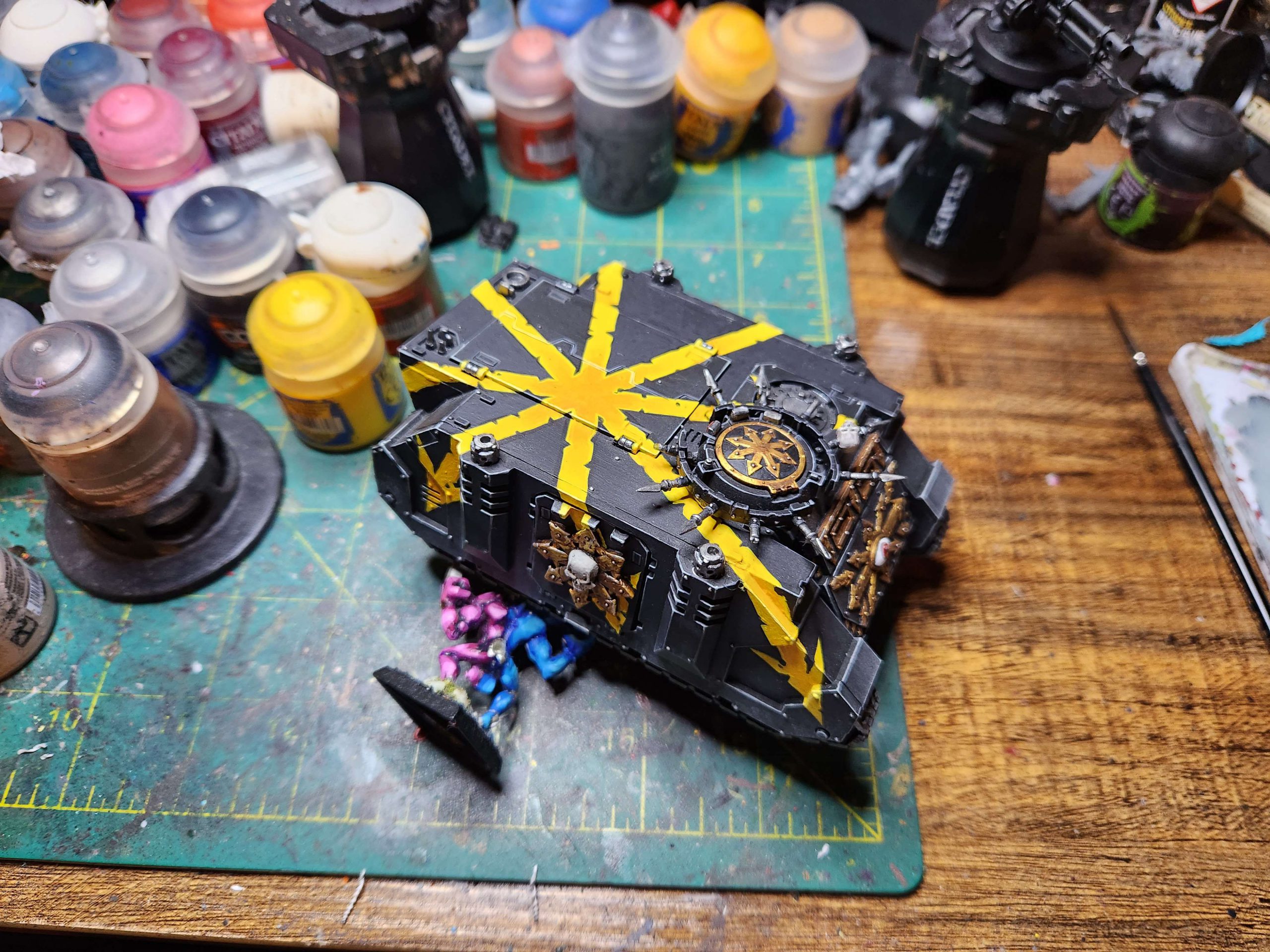 I did similar work on my Berzerkers, who needed the second level of grey highlights, then turned to my vehicles. Both my Rhino and my Land Raider needed some love. In the case of the Land Raider, I added a bunch of freehand details and runes to break up the monotony, and added some gray dust weathering to help it blend in with the display board and rest of the army. For my Rhino, I added shading to the chaos star painted across it and a second layer of celestra grey highlights. This was basically a process of shading inside the star with Imperial Fists Contrast paint and Fuegan Orange shade, then edge highlighting with Dorn Yellow.