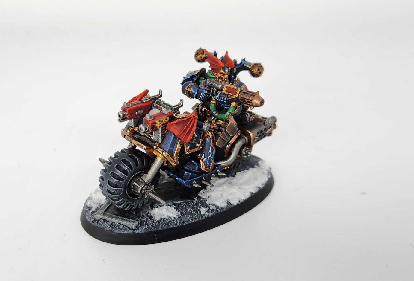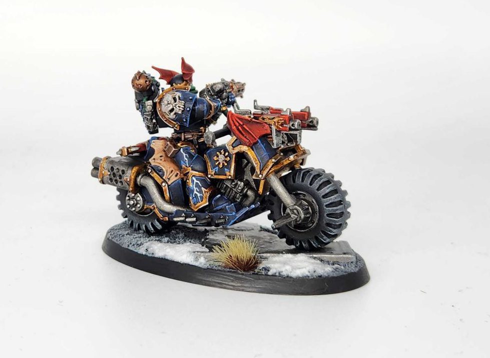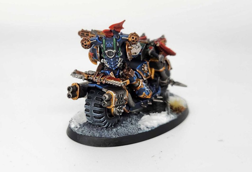 Credit: Robert "TheChirurgeon" JonesHe turned out pretty well! I'm very happy with this so far - I think he looks great, and the effect of putting a modern Chaos Marine on a classic bike definitely works visually. There are a few rough spots on there, but they're nearly impossible to see without getting into the nooks and crannies of the model, and having him on the larger, 75mm base with some extra decoration really helps tie the whole thing together. I just have two more of these to paint and I think when they're done they'll look fantastic.