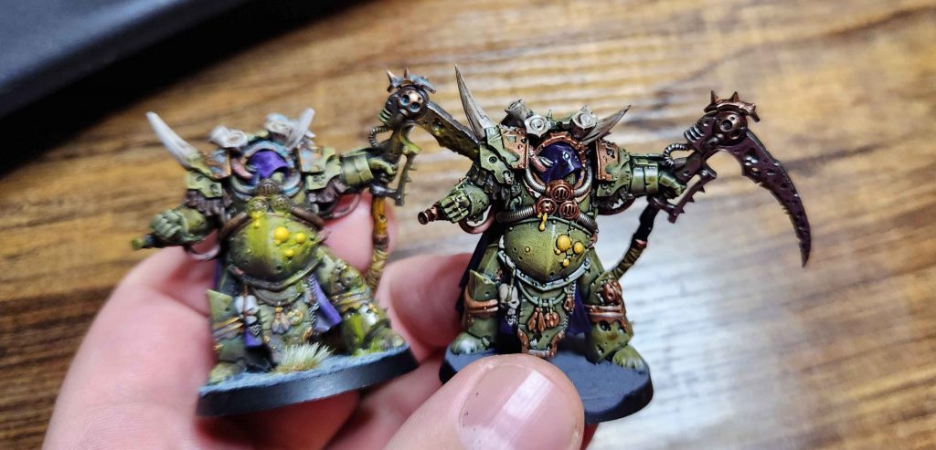 Got quite a bit of highlighting left but they're not too far off.It'll get there with another hour or so of work. At which point I'll be one step closer to complete coverage for the Death Guard army. I think a Death Guard Helbrute is next on my list, and I should get around to painting some predators for the army at some point, but I'm likely going to wait on big adjustments like that until the Codex comes around, whenever that is (fingers crossed for the first half of next year). This army only happened because I had three defilers sitting around in my bits/unpainted pile for a long time, acquired in a liquidation of someone else's collection a decade ago. And while I have a lot of predators sitting around that I could paint, I'm not in any hurry to dedicate them to a particular army at this point. so I can wait and see there.