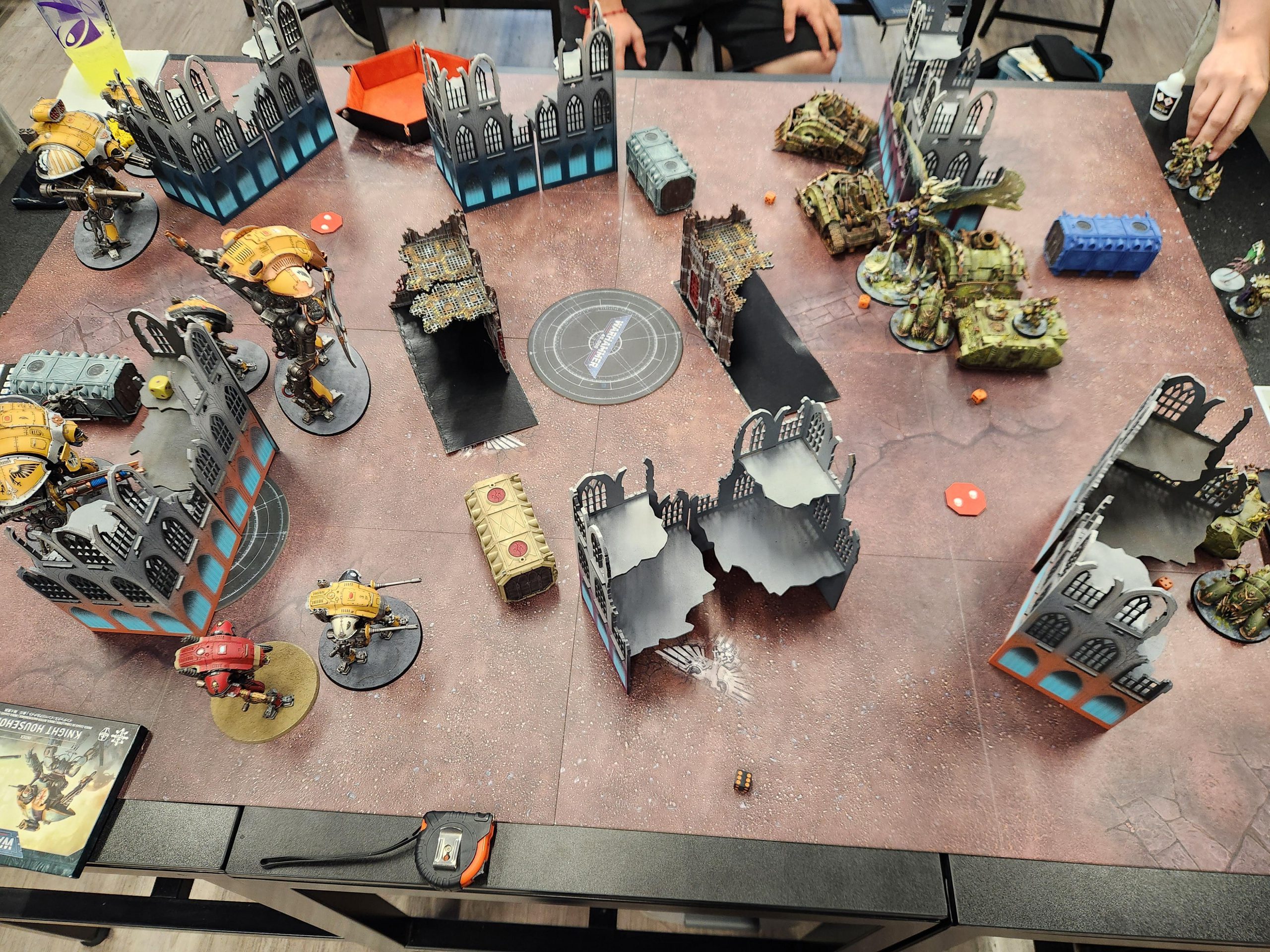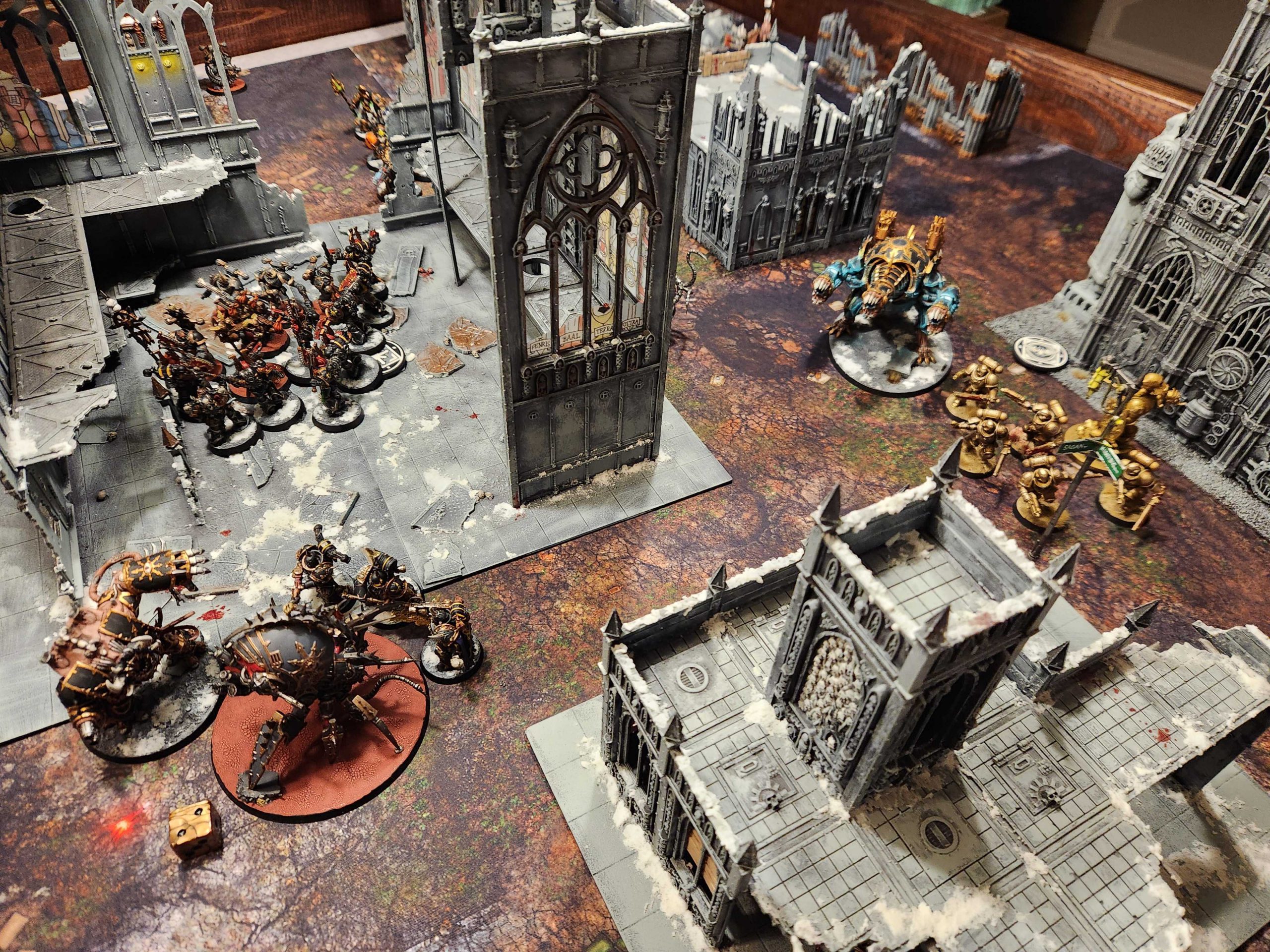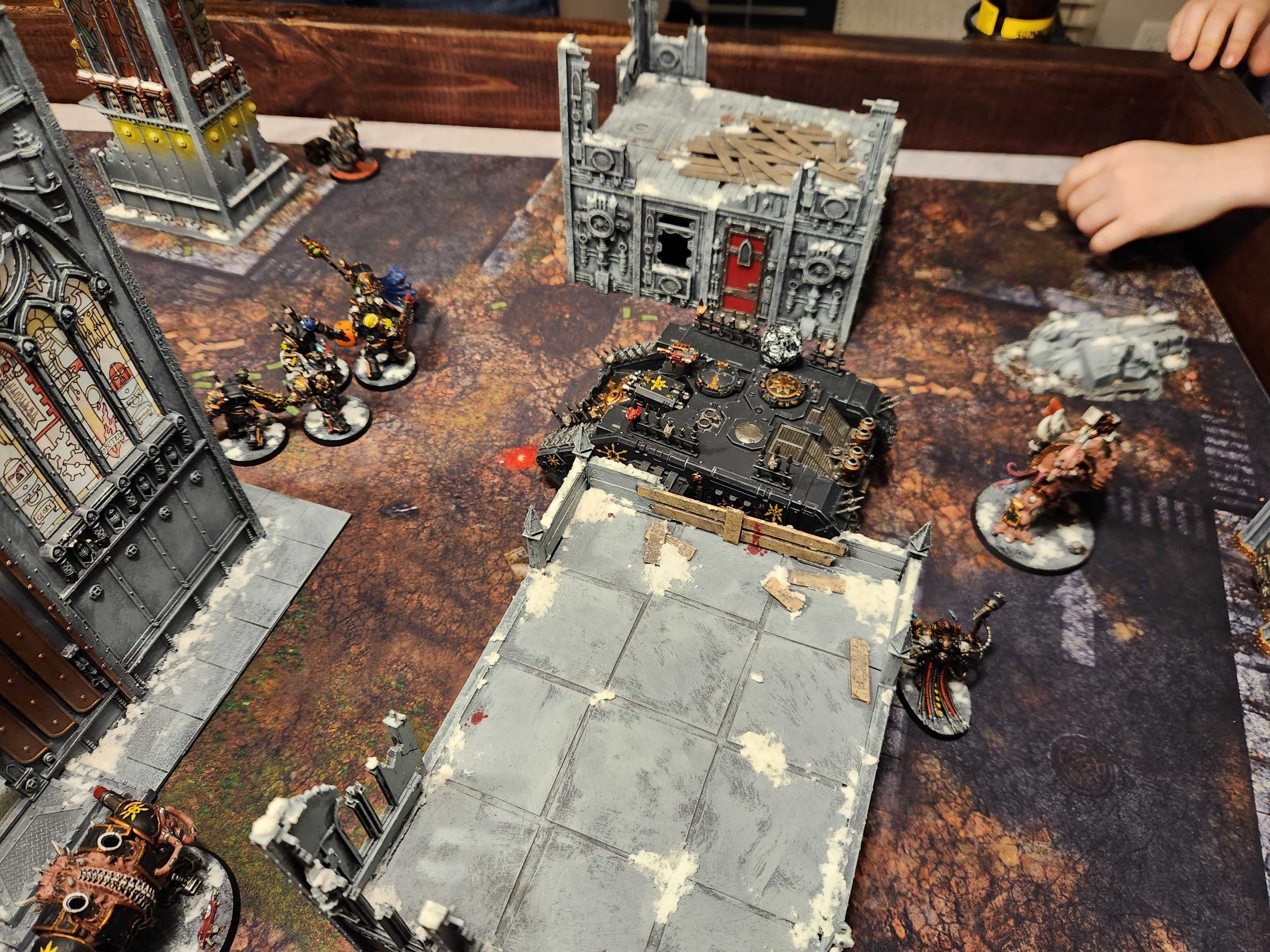 OK so two things to note about this game: First, Andrew is playing with a Greater Brass Scorpion, which is a pretty big handicap. Second, Bryce was hanging out for this game and insisted on helping me with his newly-painted Space Marines. So I opted to play down a couple hundred points and include a unit of assault intercessors with an attached terminator captain. Then Bryce promptly put them on the third floor of the ruin, telling me "they'd come down and help when I needed it," basically putting me down 200 points. Given the Brass Scorpion is about 200 points overcosted, I'd say that puts Andrew and I on even footing.