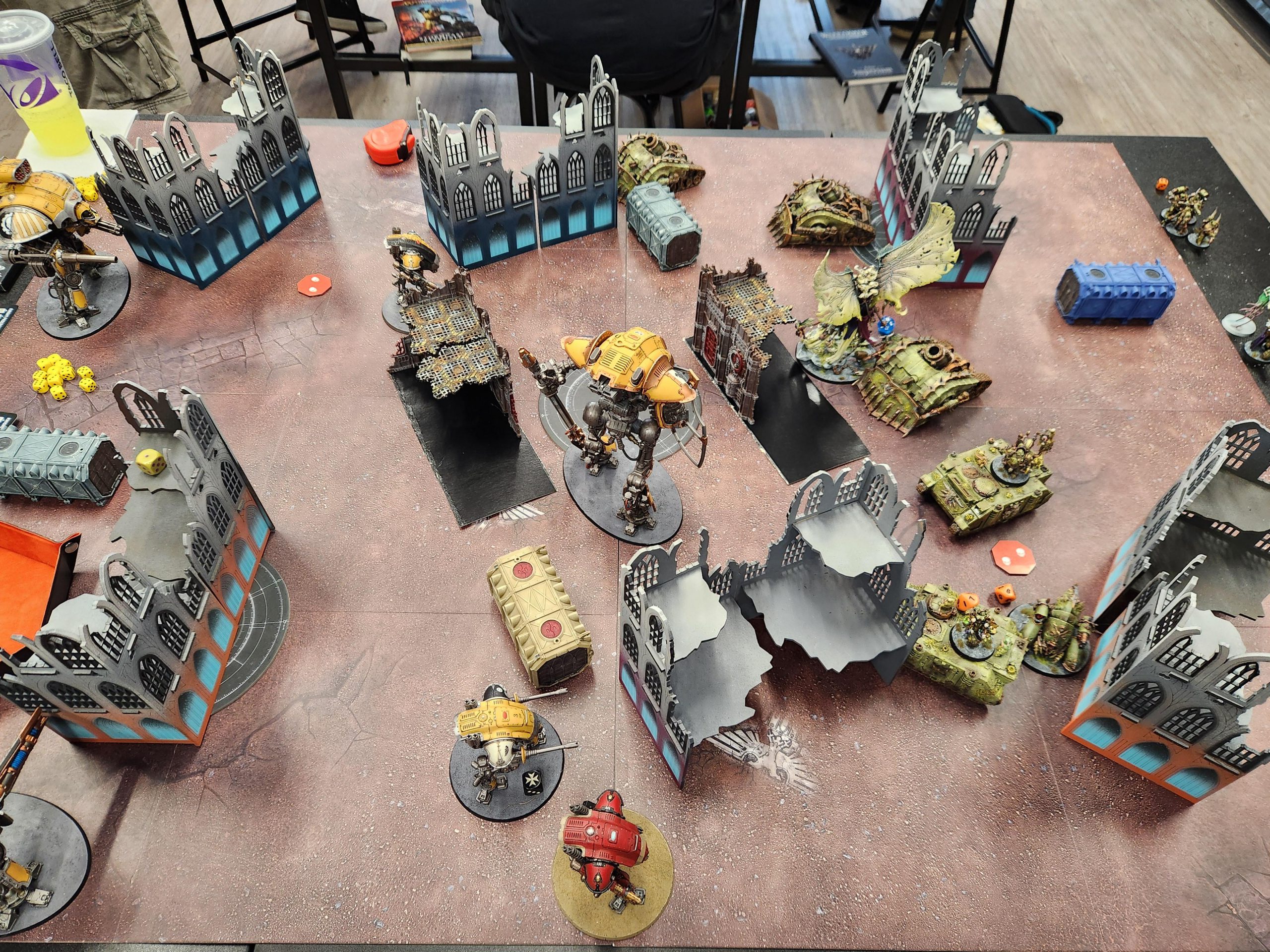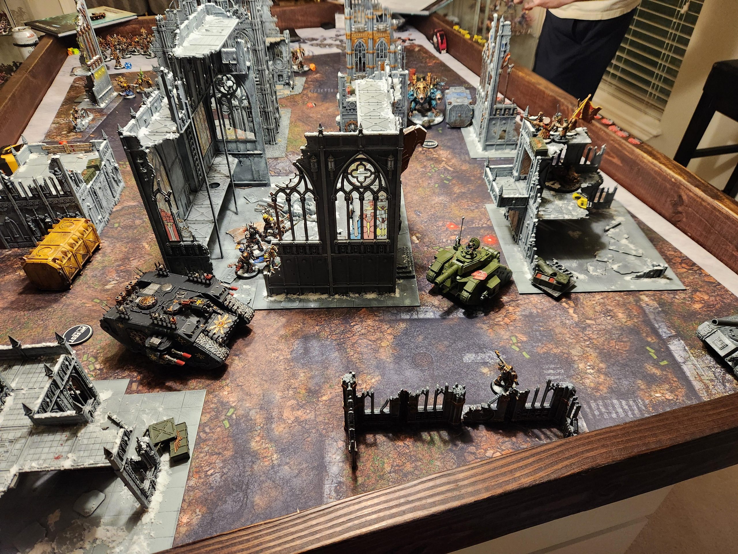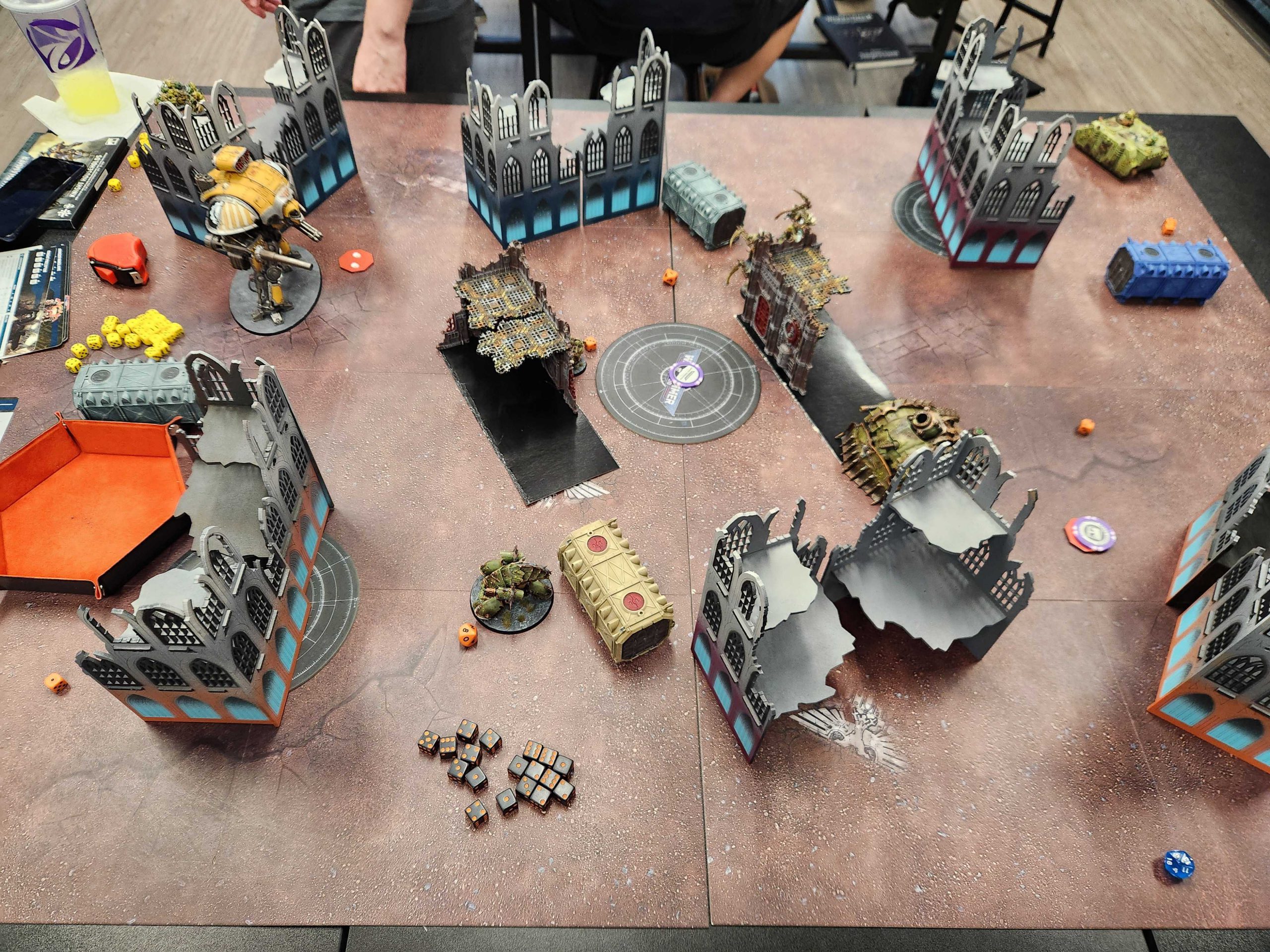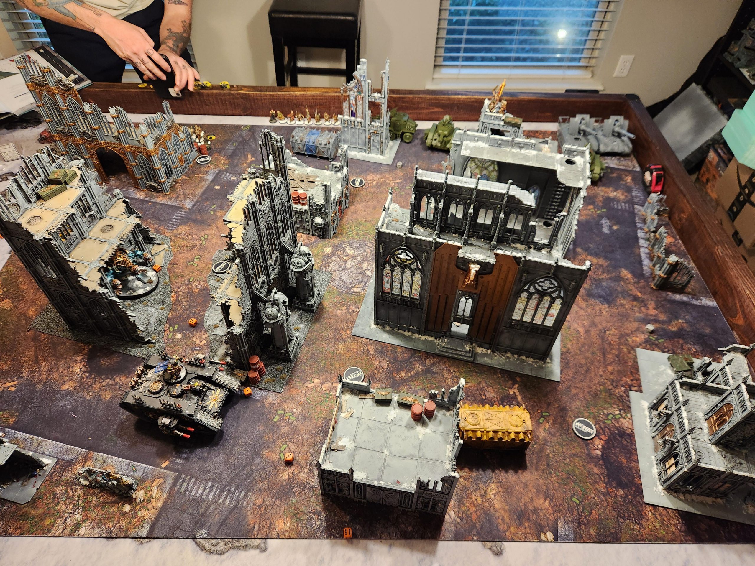 OK so two things to note about this game: First, Andrew is playing with a Greater Brass Scorpion, which is a pretty big handicap. Second, Bryce was hanging out for this game and insisted on helping me with his newly-painted Space Marines. So I opted to play down a couple hundred points and include a unit of assault intercessors with an attached terminator captain. Then Bryce promptly put them on the third floor of the ruin, telling me "they'd come down and help when I needed it," basically putting me down 200 points. Given the Brass Scorpion is about 200 points overcosted, I'd say that puts Andrew and I on even footing.