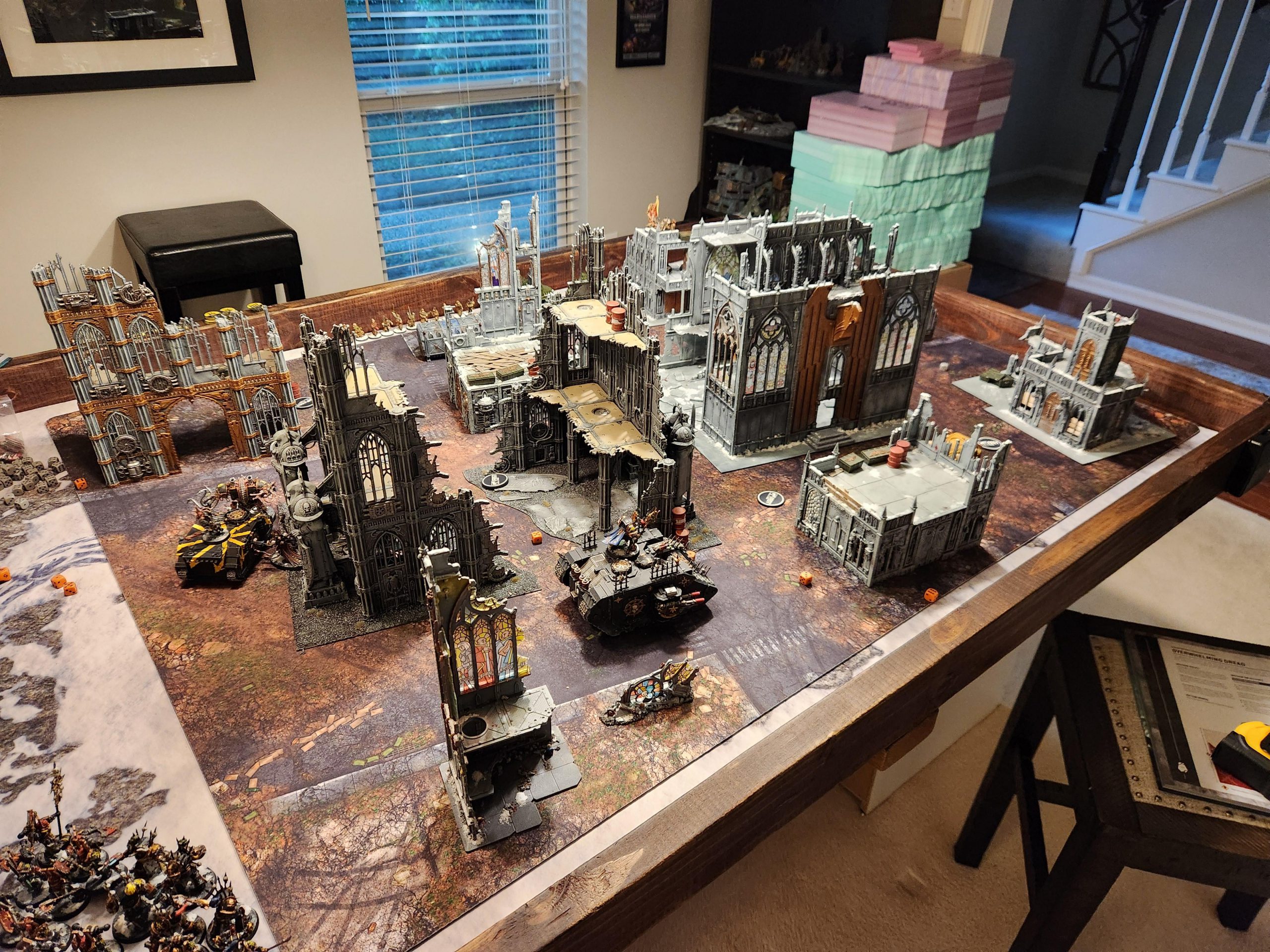 There are two competing Chaos forces on Parasbine - the Shattered Cabal and the Seekers of The Profane. Among the Seekers are Andrew's Traitor Sons of Ash, the Chaos Space Marines army he started. He comes over the next day after Eddie and we slam hams in my first 2,000-point game of the campaign when we host a small party at the house. I go with another city layout, but mix things up a bit. We also change up the mission this time around, playing Outflank from Pariah Nexus.