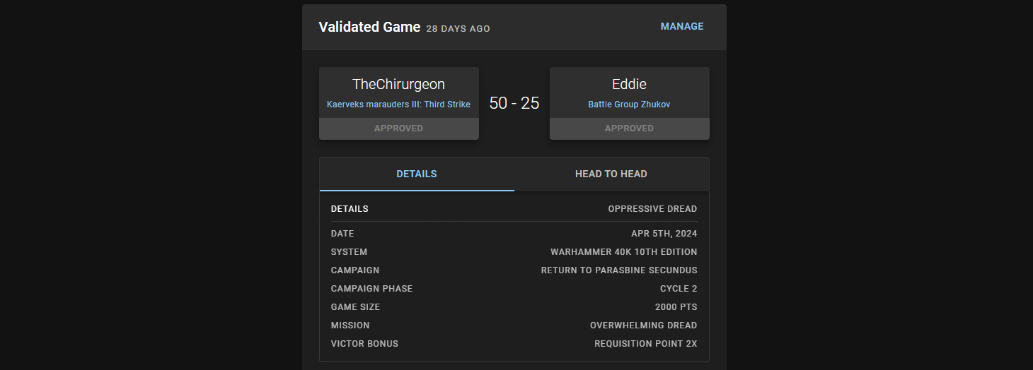 It's a fun game and I manage to pull ahead on points in the final two turns as the Terminators hold on to that objective in the cathedral. Eddie was a blast to play and after the game his other basilisk leveled up, getting a weapon enhancement for +1 damage and Precision. Good lord.