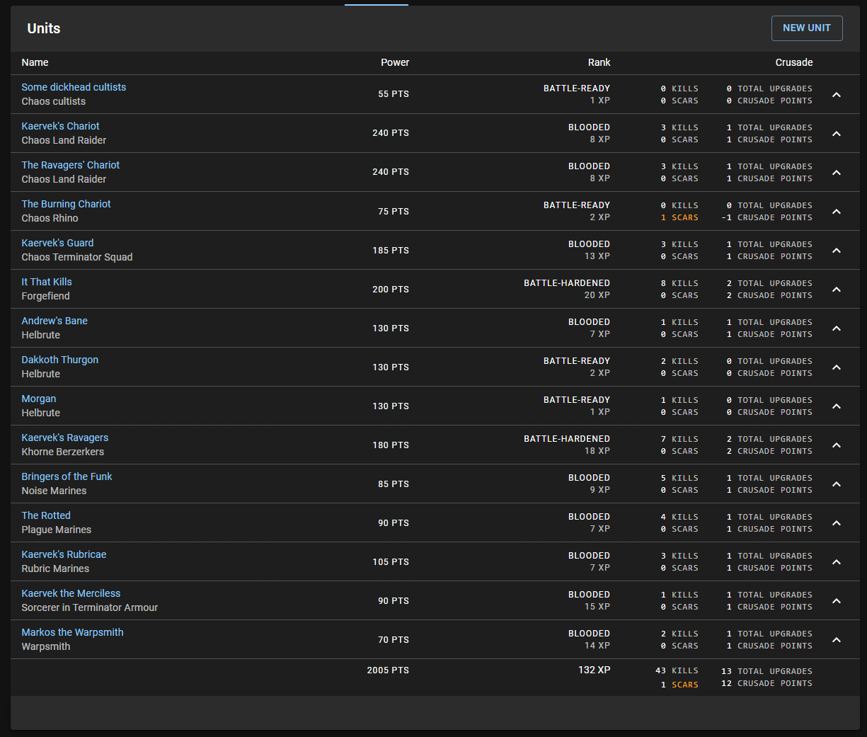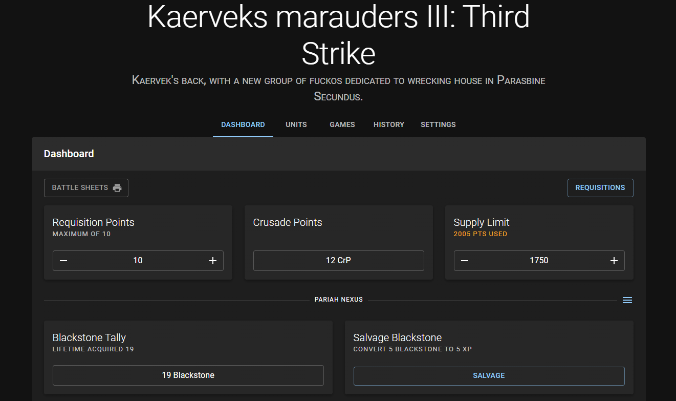 It's been a bit since my last Crusade game, but my plan is to try and get one more in before Dallas. At this point we're running into that period of "late-campaign fatigue" that's pretty common after games get to the 2,000 point level and take longer, and we're working through how to manage some of that, possibly by consolidating teams.