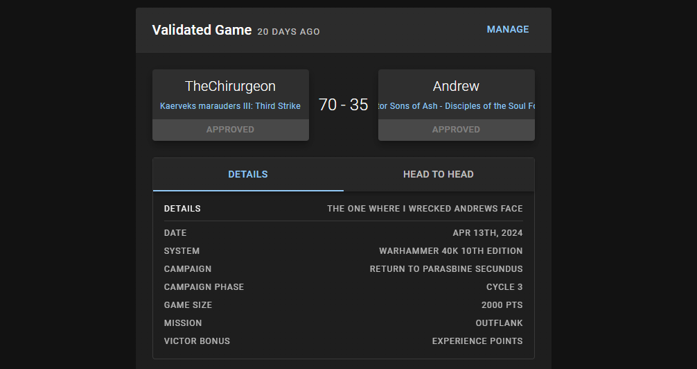 Greg puts up a solid fight but just doesn't have the resources on rounds 4 or 5 to mount a comeback, and dropping primary points in rounds 3-4 really hurts him. Greg's a fun guy to play against and he teaches me a couple of things I wasn't aware of during the game and it's a good test for how I'd deal with a knights army. I'm honestly not sure if -1 saves was the play here - I *think* it was, but I question whether -1 to WS/BS might have been more useful with the number of invulnerable saves I was up against when it came to my heavier shooting attacks.