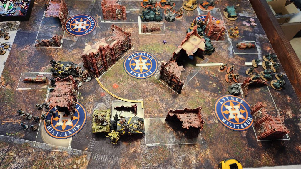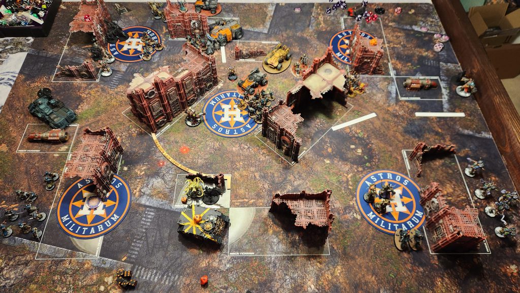 This puts T in a bind on the following turn, where he now has to commit resources to killing me if he wants to win, but he draws Cleanse and Containment, and cannot afford to waste units on trying to score them. He blanks on secondary VP on turn 2 and that costs him the game. I start burning the objective in the lower right.