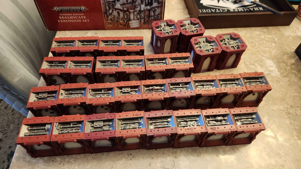 adding bone panels and the metallic pipesIt's a pretty simple process - Kevin laid down the red with some black oil washes over everything. He'd also done some drybrushing and and bone panels, but the bulk of those are up to me, so I've been laying those down, plus painting the tops with leadbelcher, then going back over to touch them up, paint any pipes, and drybrush them all with bone. I should have the whole thing done next week.