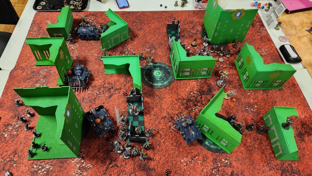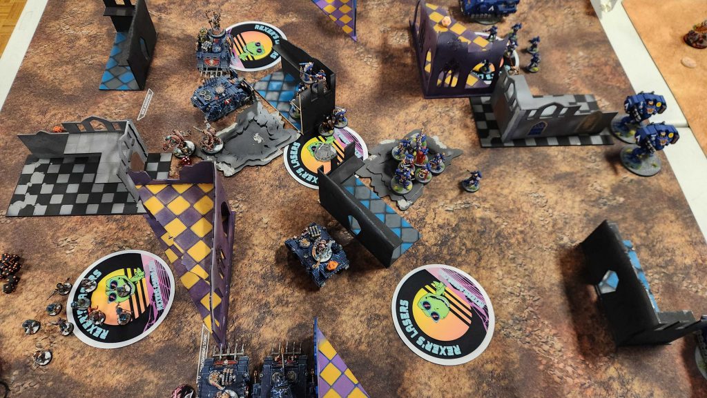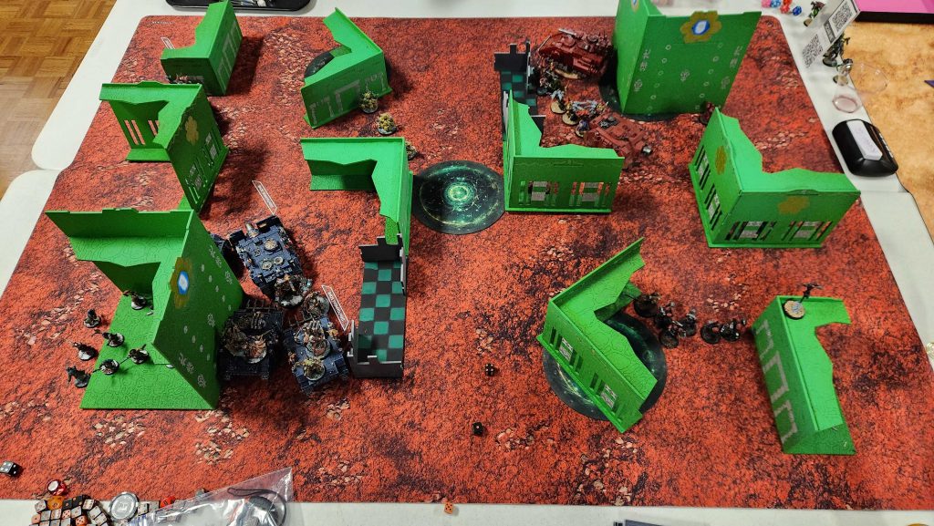 This one ended up being an absolute nail-biter. Gabriel charged into me with Sanguinary Guard early on and I learned pretty quickly that the combo of a 2+ save and 3 wounds plus -1 to be wounded made those guys an absolute nightmare for my power fists, and having Lance on their S6 spears meant I wasn't getting anything out of having T5 anyways. I managed to take one unit out pretty quickly while I kept feeding single units to Gabriel on the south objective, thinking that would tie him up and slow him down. In retrospect this was a mistake - I should have forced him to come to me where I could gang up on him instead of giving him the free points for Rhino kills.