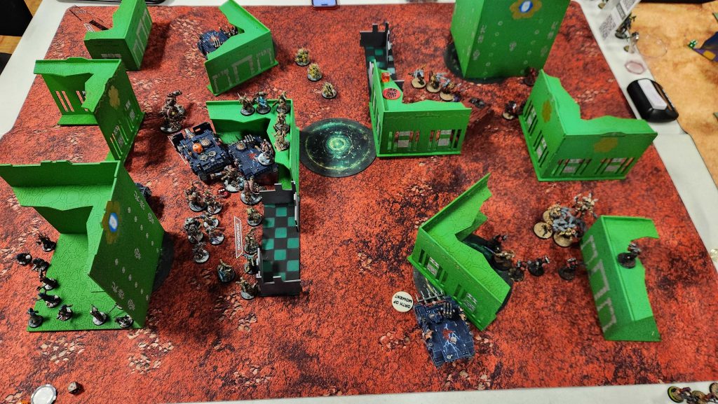 This will end up being the easiest game I play all weekend, though not necessarily because James is a weak player - while he's not as good as my other opponents, he's also playing a list that just doesn't match up well into mine. I can easily apply heavy pressure to his army with little fear of retaliation as long as I can avoid and handle Guilliman and Calgar's unit. I kill the Scouts as early as I can, wrapping them up on turn 1 in order to ensure they won't be popping up in my backfield at any point. Then I commit to screening back there most of the game to stop Assault Marines from taking my home objective, which is otehrwise the biggest threat James can offer. Assault Intercessors aren't terribly frightening when they have to fight T5 Plague Marines or Chosen, but I need to stop them from going into Cultists. Screening them means that once they come down and the scouts are dead, James can't pop up behind me any longer.