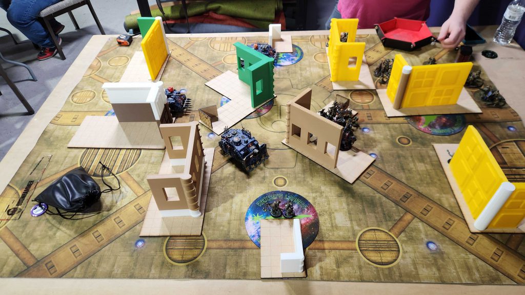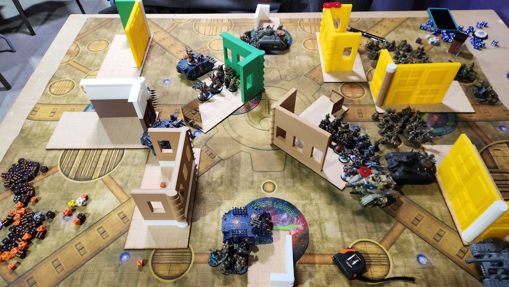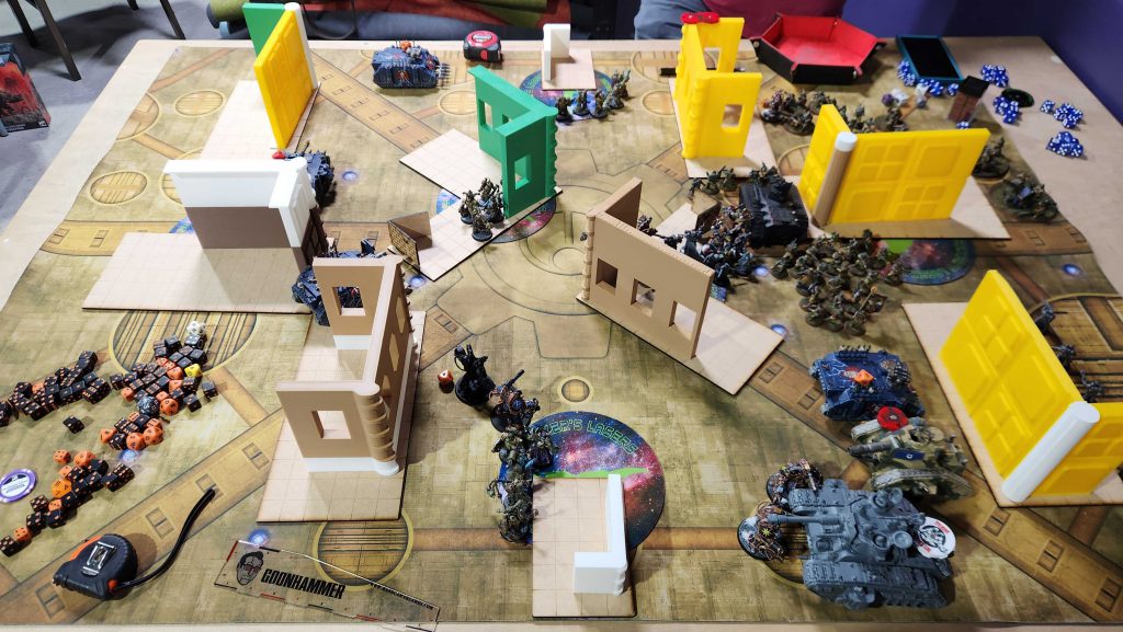 Connor posted a screenshot of his list in the text chat so I don't have the exact list on hand to copy paste but he's running the Siege Regiment, and he's running on older rules. My updated list is only possible because Nurglings dropped 5 points, so we have a brief discussion about lists. This is mostly a mistake on my part - the League is pretty loose on what can be run, and up to now my opponents have been taking lists different to what they originally posted, as they've been testing out other lists. That's fine by me, but Connor isn't on that wavelength, and he's technically correct. I didn't bring the Warp Talons with me, however, so we agree to split the difference - I'll run new Nurglings and my updated list, and he'll get to use the older, more powerful Combat Engineers.