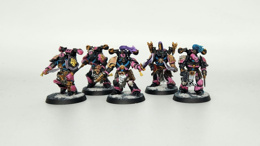 I'm currently working primarily on some [REDACTED] stuff you'll see soon, but in the meantime, I have also had some time to paint more Emperor's Children. In particular, I've been working on a unit of Infractors, swapping out the arms on some older Noise Marine conversions I did using the new arms and shoulder pads left over after I built Tormentors with my Champions box.