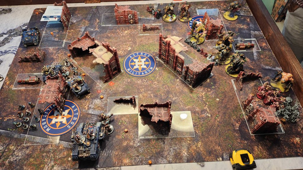 This one was closer than I thought, despite my going first and getting the advantage from that. I had some pretty rough secondary luck in this one, drawing Marked for Death turn 1 and having a turn 4 marked by Sabotage and Recover Assets at a time when I couldn't afford to spend time doing either. I spent my first turn dropping a predator using the vindicator + land raider, and dropped another on turn 2 while picking off a ton of poxwalkers with small arms fire from the Land Raider and other vehicles.