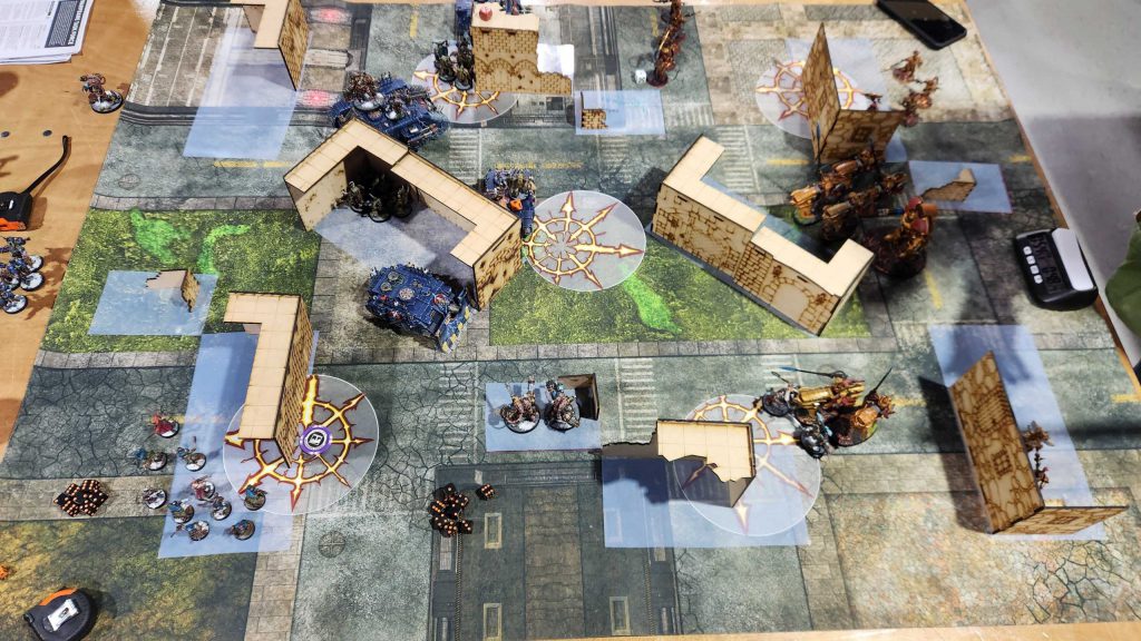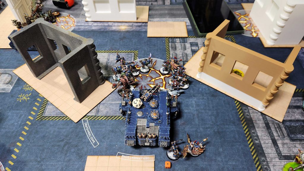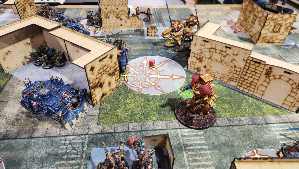 My big concerns here are the melta dogs - they can do some real damage - and mostly holding objectives. I draw Bring it Down and Recover Assets on turn 1 and that's about as bad as you can get on T1 against Chaos Knights - there's only one war dog I can conceivably destroy and while I get it, I'm only at 2 VP on secondary. This shifts my plan - the Ritual is a bad mission for Chaos Knights if they have to spend activations creating objectives so I make it my goal to kill the cultists instead. I wipe both units at midtable and kill most of the Accursed Cultists in one go, using the Land Raider as extra insurance for the Chaos Lord and his Legionaries.