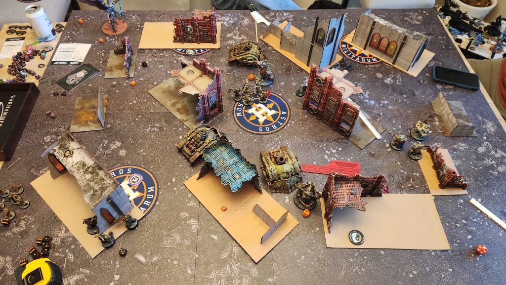 For my fifth game I was playing into Scintillating Legion, the Tzeentch-specific Daemons army. The way this army works is that it generates flux tokens it can spend on re-rolls for hits, wounds, saves, and damage, and when it spends them you get tokens you can spend to re-roll a hit, wound, or save. Spending those hands them back.