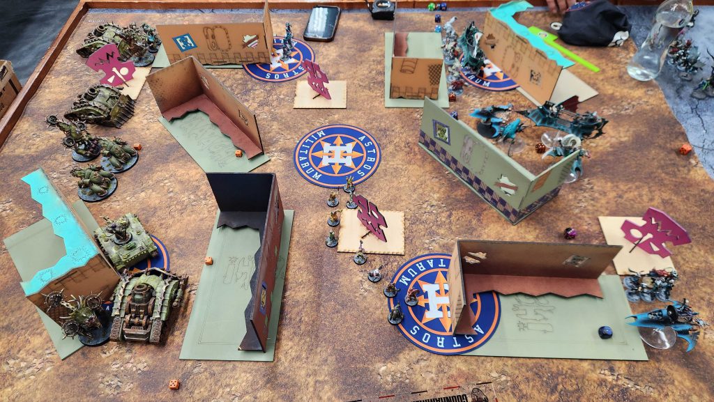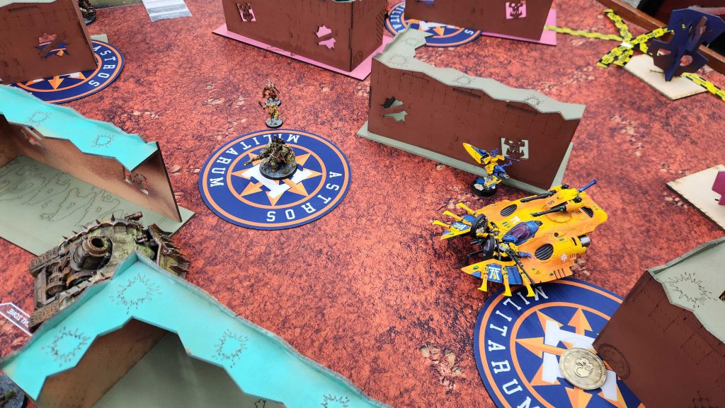 Round 2 is against team Sanctum, one of the best teams in the area. It's a tough matchup for us, made tougher by the fact that there's a lot of overlap between our team and theirs, and so they kind of know most of our tricks. I'm paired into Steven Salazar, a wonderful person I've played against on several occasions. He's on Ynnari, which is a tough matchup for me - while the PBCs are good into elves, the fire dragons and dark reapers are a real issue as they'll just absolutely carve up my vehicles.