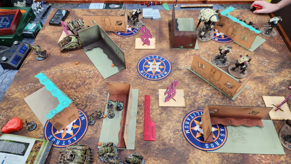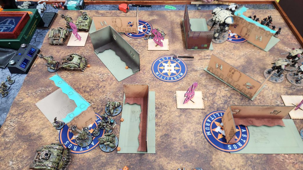 This was the entire game. I didn't capture the middle objective - a five-point swing on Take and Hold, and that Armiger combined with the Helverins to kill all six of my Deathshroud, who were now unprotected instead of being able to kill an Armiger and sweep into the next target. To add insult to injury, the remaining Armiger with 2W charged into my PBC and killed it, then when I shot it to death, it exploded and wounded all of my units. Just rancid shit.