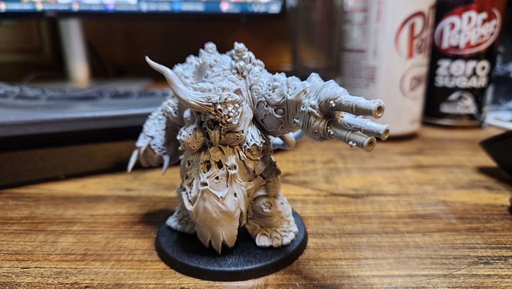That's a Forge World Daemon Prince of Nurgle, and while he comes with another goober to follow him around, I don't need that guy to run him. I was originally planning to dig up my old 40k Nurgle DP - the really sick metal model - but I couldn't find him, so this guy was the pick I went with. He's easier to paint, in that I don't have to spend as much time picking out details on him. I spent Tuesday assembling him, primed him on Wednesday, and painted him last night and this morning. He's ready to go: