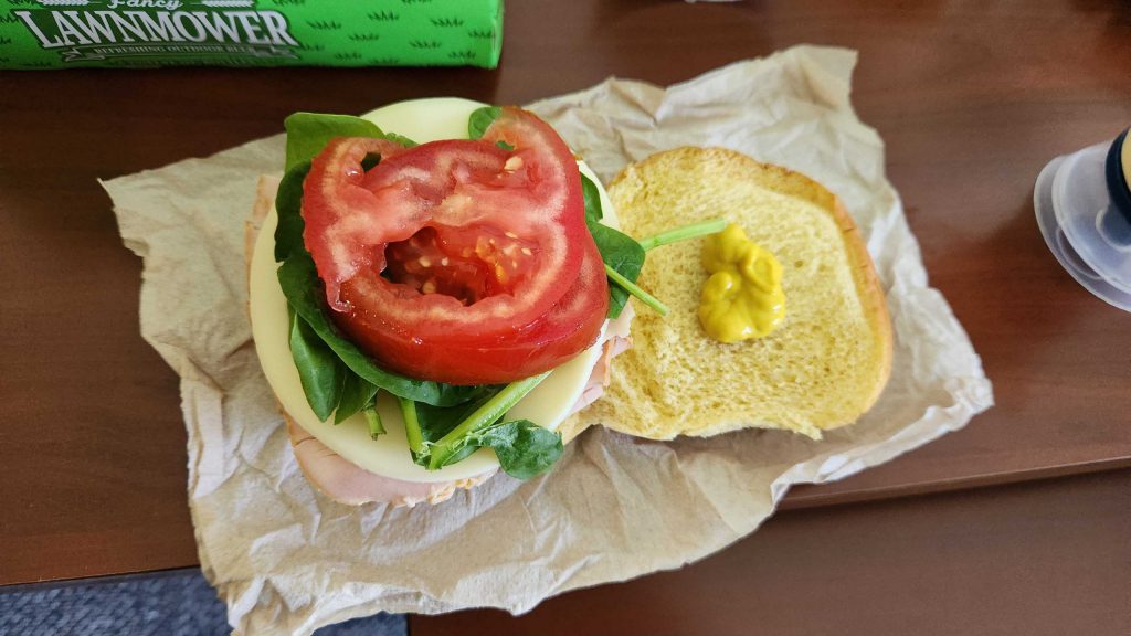 I forgot to bring platesI picked up a some potato rolls, some baby spinach, a couple of tomatoes (I brought a small knife and cutting board), plus some mesquite turkey, black forest ham, and provolone from HEB and brought that along in a cooler lined with ice packs. As accompaniments, I brought some small bags of chips and some fruit - mango and blackberries. This makes for some tasty sandwiches, is extremely cheap - our total lunch cost across all three days was something like $20 - and has the added benefit of just being way healthier than anything we'd eat at the venue. It's a pro strategy.
