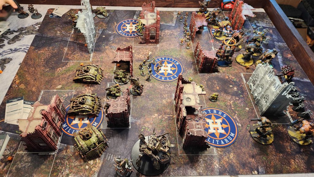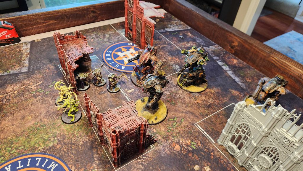 You may remember Luke from a few weeks ago, when I was testing my army against Codex: Chaos Knights. Well, Luke was back again this week, mostly because he had to drop something off at my house, and we played another game in the meantime. Luke has been testing new builds with Chaos Knights and this time around decided to test something with the War Dogs detachment and a heavier dose of Daemons, packing Bloodletters, Flesh Hounds, Nurglings, and Beasts of Nurgle. This is all a net negative against my list, as the mortars love killing Flesh Hounds, and I'll gladly spend a turn or two picking up cheap scoring units to make the dogs worse.