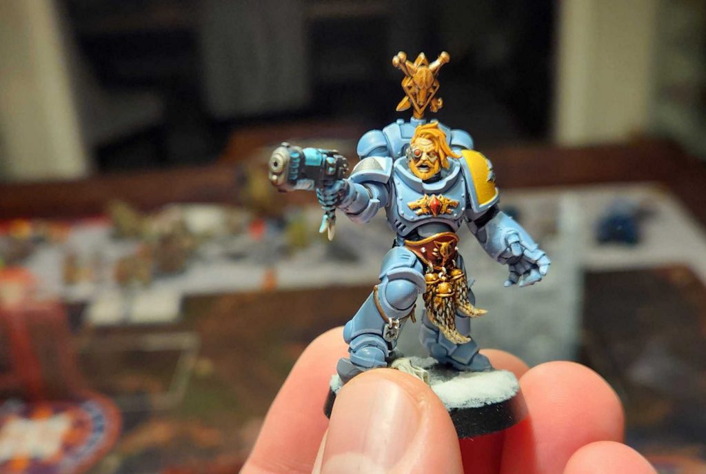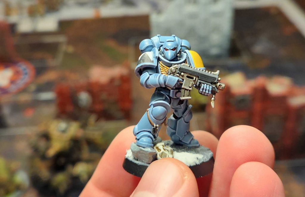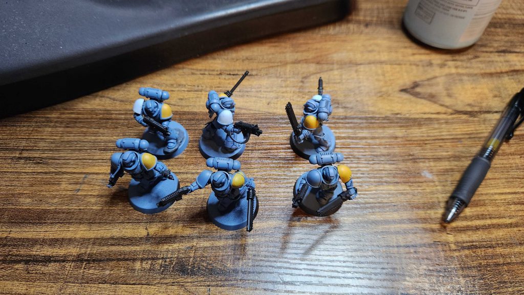 I try and do the panel lining, shoulders, edge highlights, and weapons as batches, then the rest of the details are individual model things.
