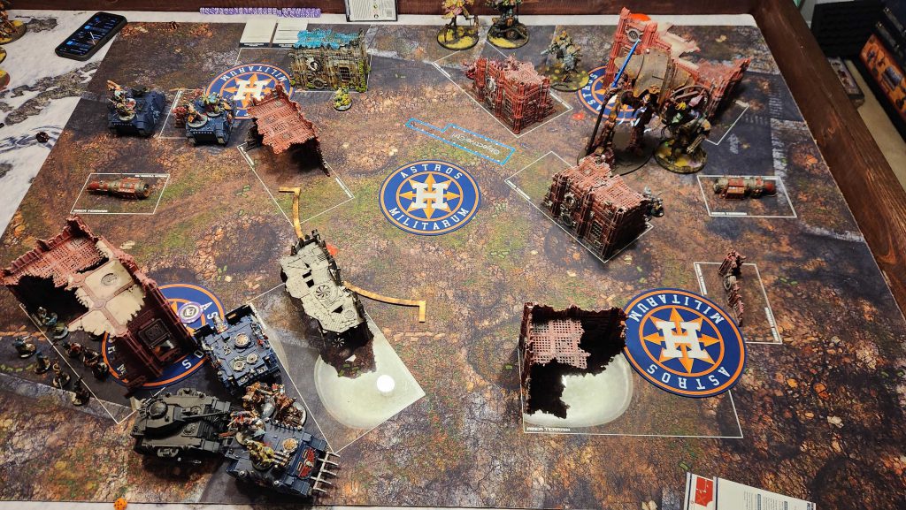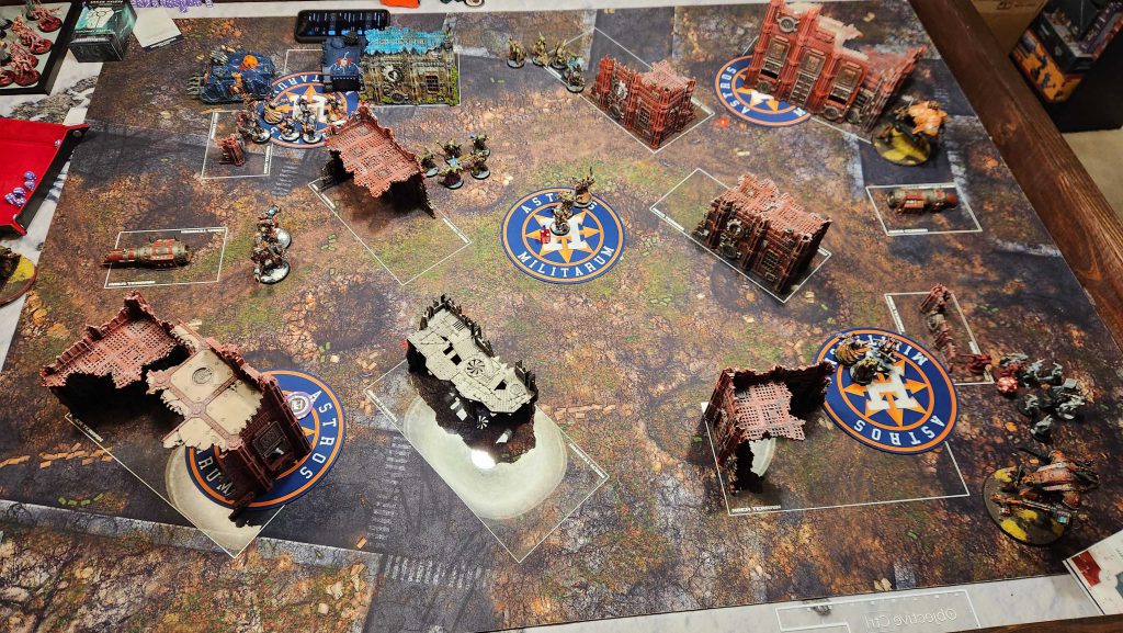 That's a big advantage on Burden of Trust, and I spend the first turn getting into position and taking a few shots at the Accursed Cultists. I draw Overwhelming Force and Assassination, and ditch the latter for points. On Luke's turn he draws Recover Assets and Sabotage and makes what I think is a pretty big mistake - he spends 1 CP to chuck Sabotage, ending up with Marked for Death as the replacement. This is not only wasteful but unnecessary - Luke had an easy path to Sabotage with the Lancer or a War Dog around the side of the table, and likewise could have accomplished Recover Assets as easily. He also wasn't behind on points - I had blanked with my T1 draws. The net effect is that he ends up not finishing Recover Assets - I kill one of the War Dogs attempting it - and Marked is pretty much unscorable based on my unit picks, so he's blanking that turn.